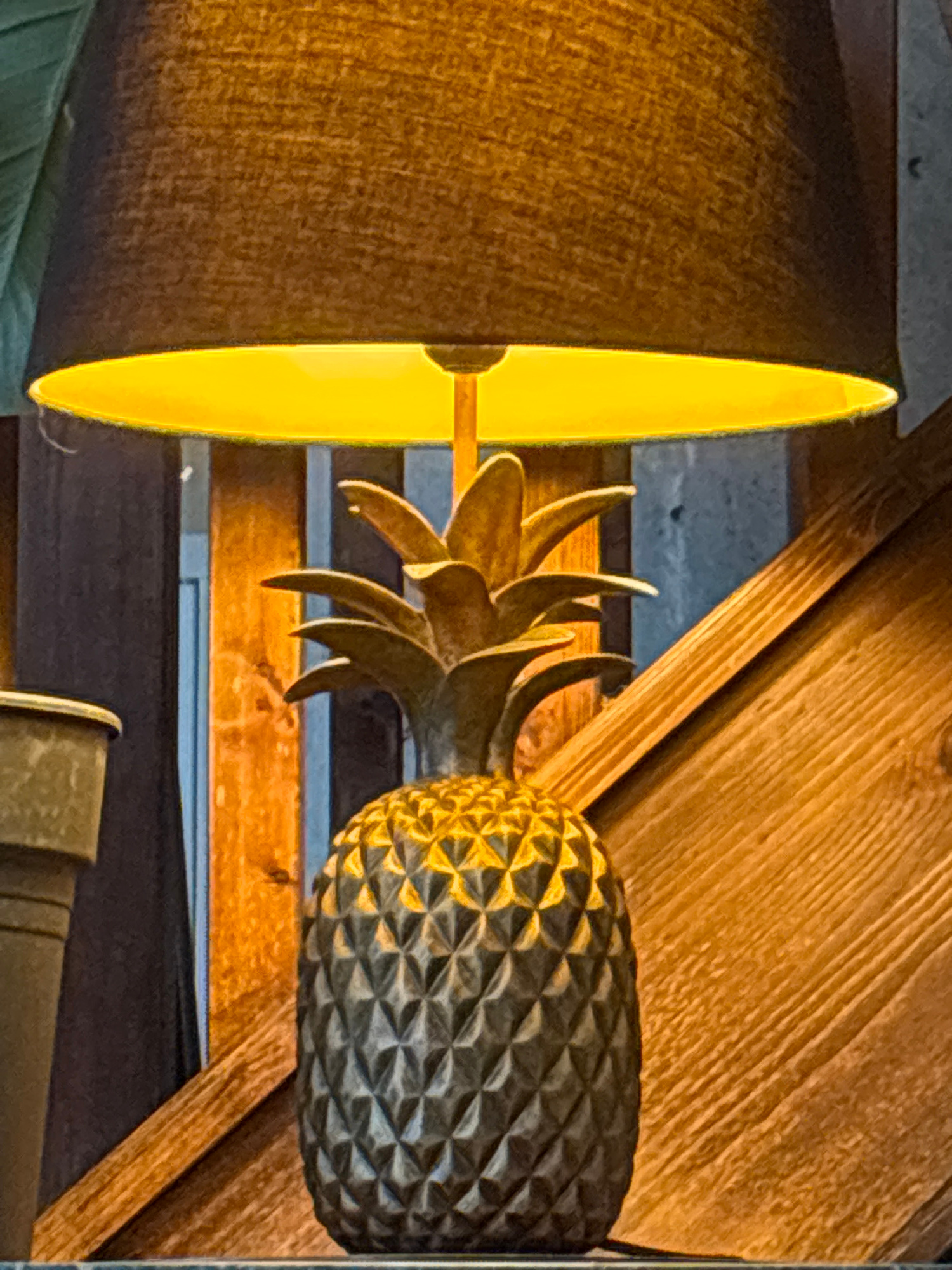 The image shows a pineapple-shaped lamp affixed to a wooden structure. The lamp features a textured, diamond-patterned pineapple body and stylized metal leaves around its base. A cylindrical lampshade…read more