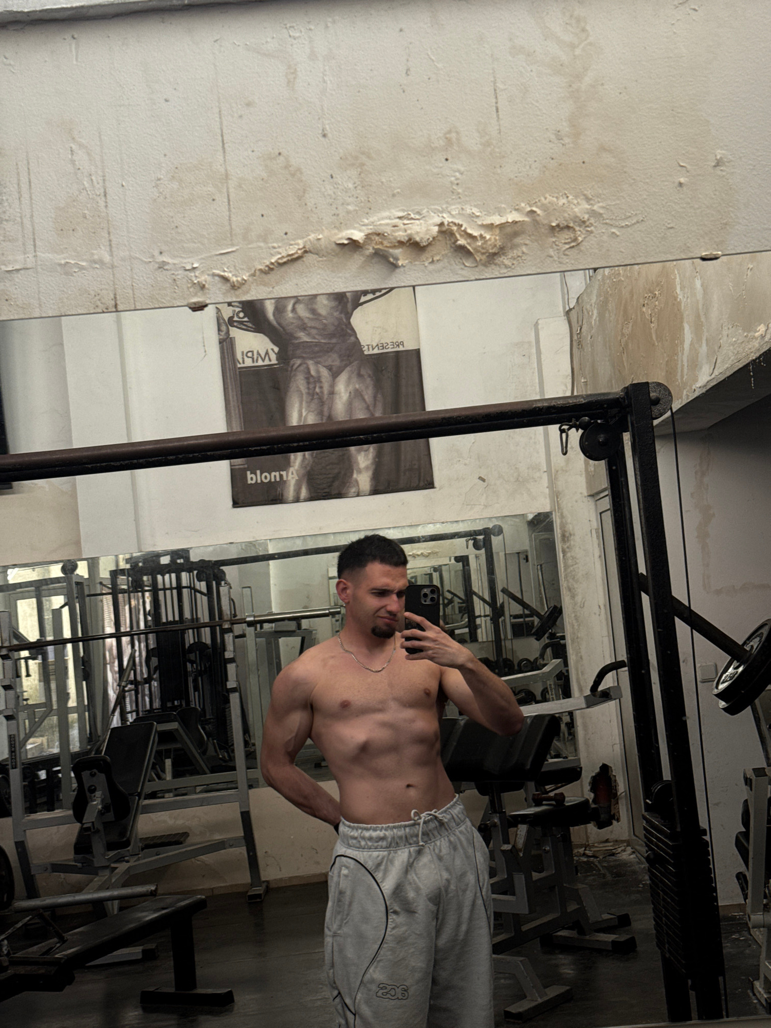 A sideways-oriented indoor photo captures a shirtless young man posing in a gym in Shumen, Bulgaria. The man, with short dark hair and a beard, is positioned on the right side of the frame, looking to…read more