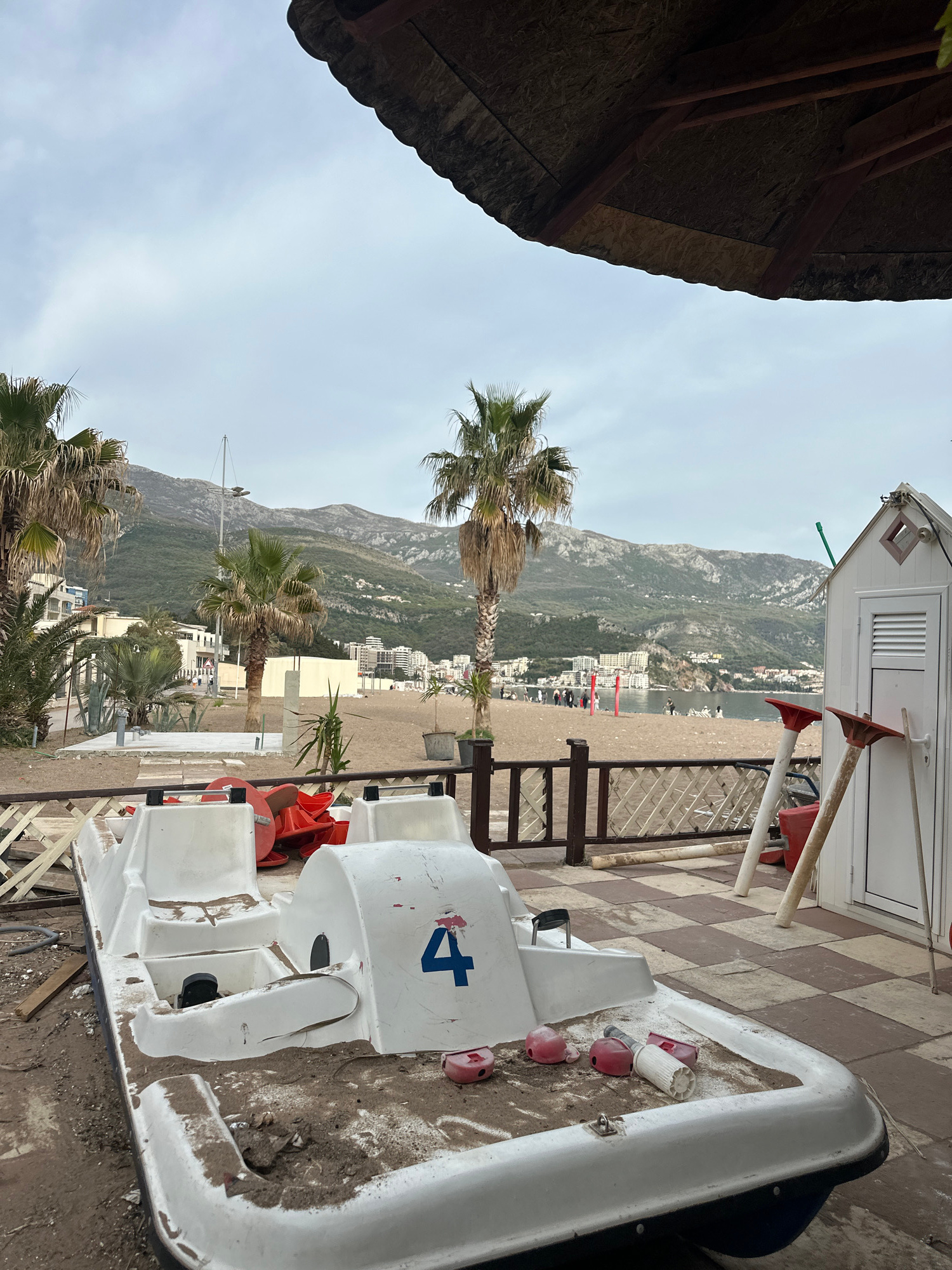 The image shows a beach scene in Boreti, Montenegro. A white pedal boat, labeled with the number "4," sits on a checkered tile surface, likely a patio or walkway adjacent to the beach. In the backgrou…read more