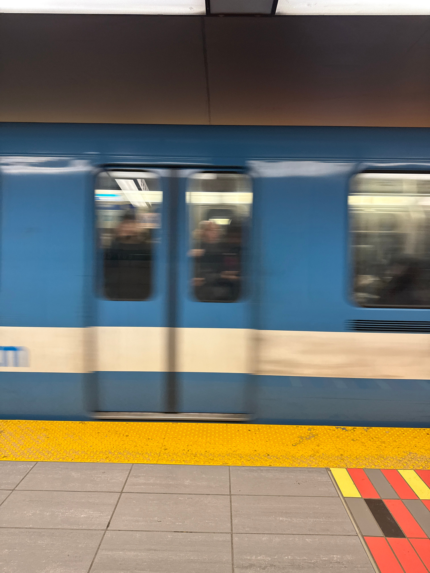 A blurry, side-view image taken at a low angle depicts a train passing through a metro station in Montreal, Canada. The moving train is primarily blue with a white stripe and visible windows, some of…read more