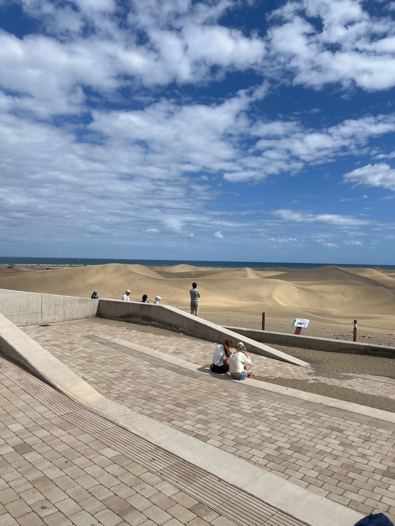 The image shows a scene in San Bartolomé de Tirajana, Spain, where sand dunes meet the ocean under a sky with patchy clouds. People are present at an elevated walkway and viewing area made of brick-li…read more