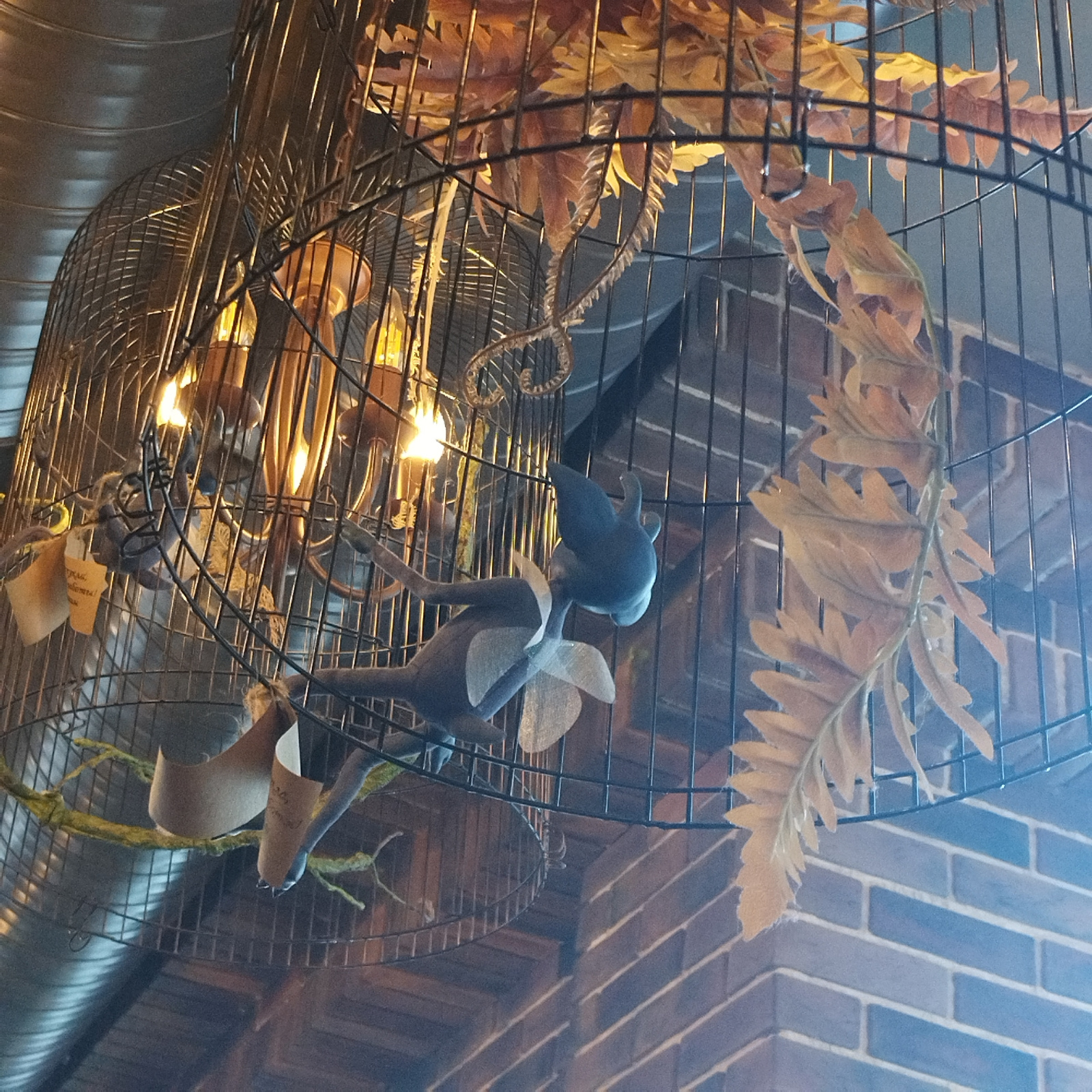 An indoor scene showcases an elaborate decorative installation featuring multiple large, black metal birdcages, possibly repurposed as light fixtures, hanging from a ceiling. Inside the cages, artific…read more