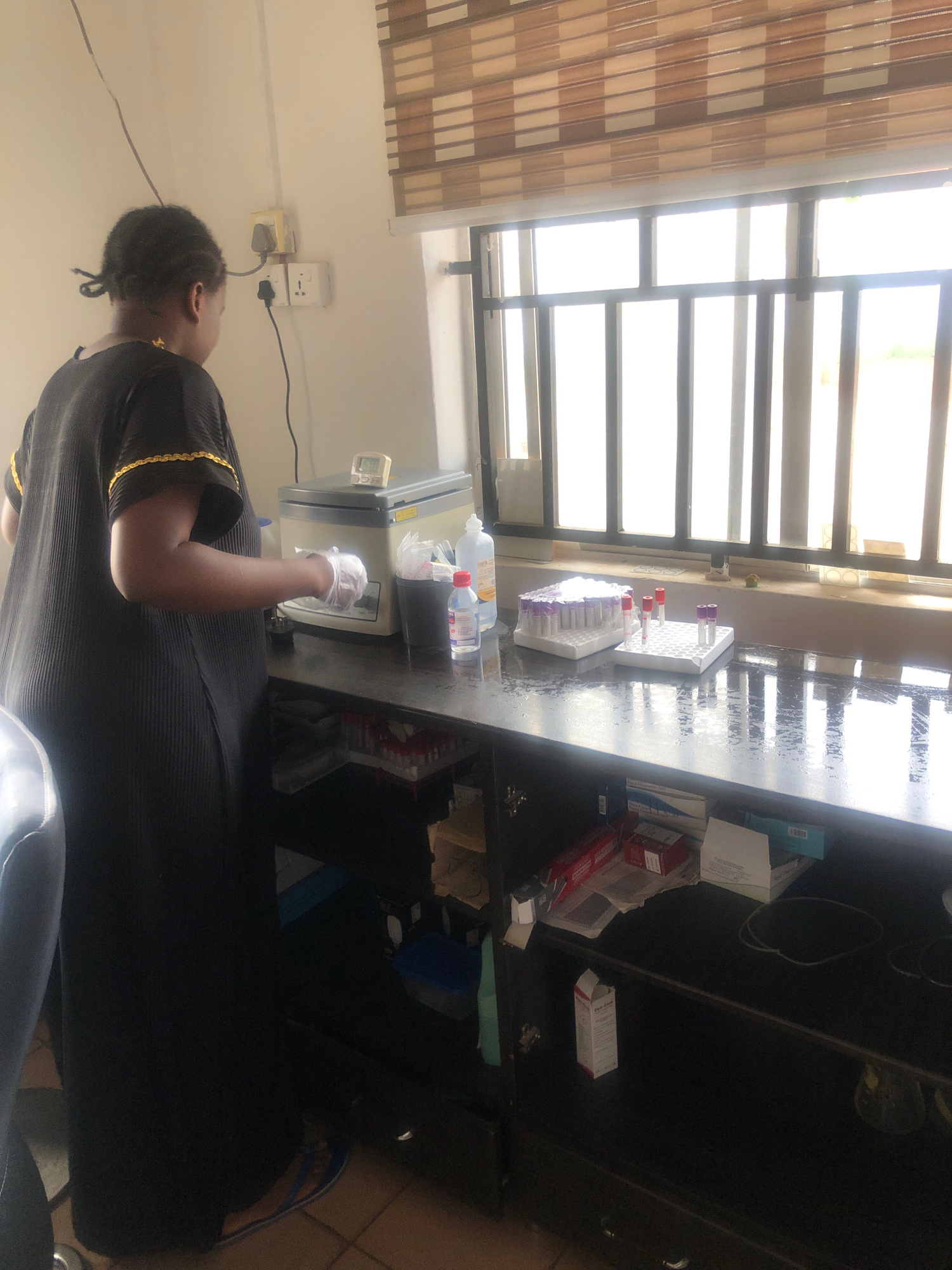 The image shows an individual working in a laboratory setting in Jos, Nigeria. The person, wearing a black dress with gold detailing, is standing at a counter wearing gloves while working with equipme…read more