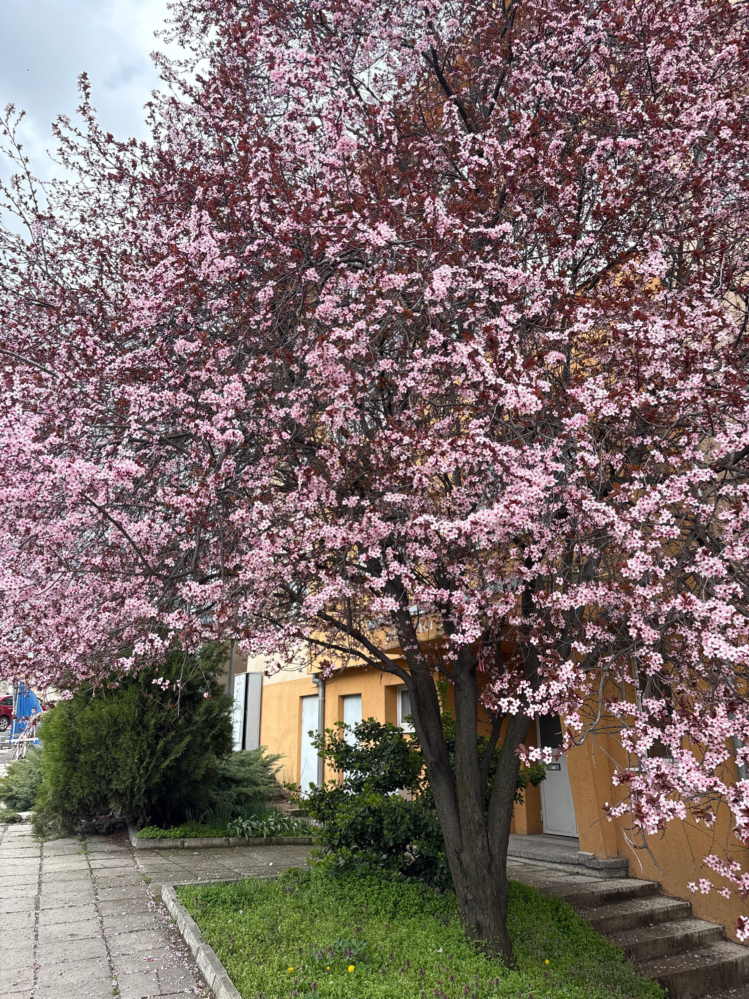 A blooming tree, possibly a cherry plum, dominates the scene, its branches filled with pink blossoms. Behind the tree, a yellow building with visible windows and a white door can be seen. To the right…read more