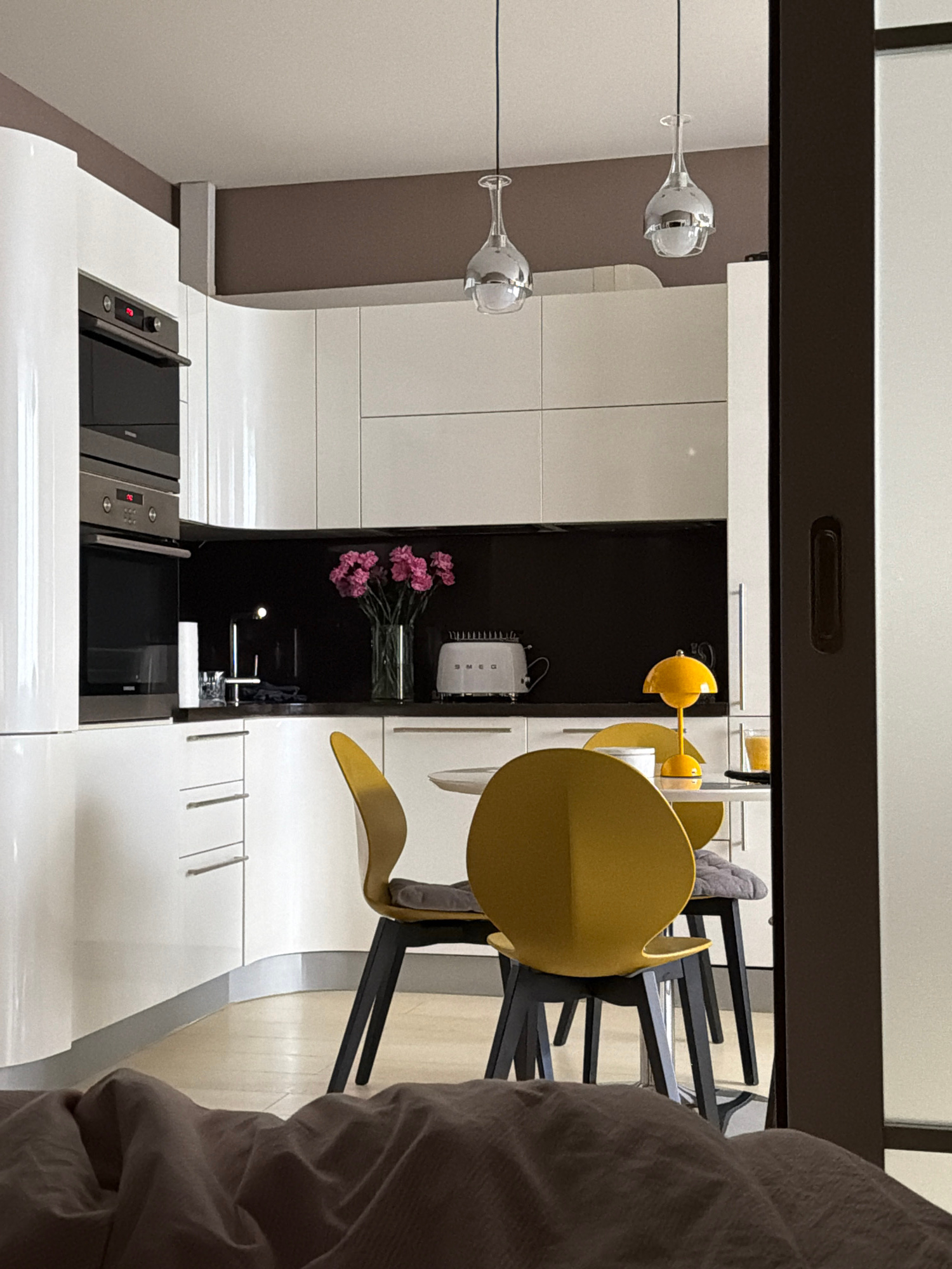 The image shows an interior, likely a kitchen, in Khimki, Russia. The kitchen features white cabinets, a built-in oven and stovetop, and a dark-colored niche housing a vase of pink flowers, a Smeg app…read more