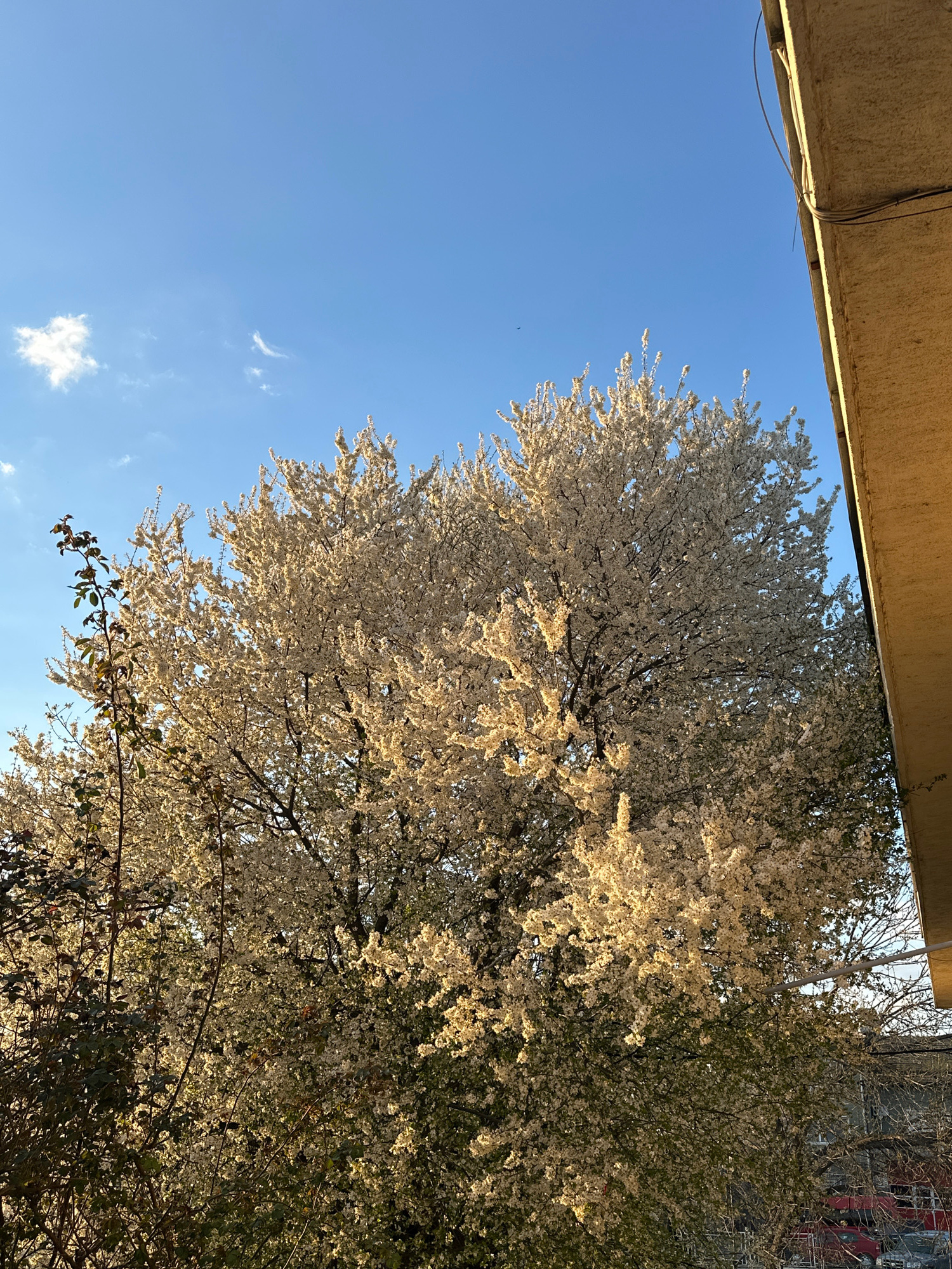 A low-angle shot shows a tree in full bloom against a bright blue sky with scattered clouds. The tree's branches are densely covered with white blossoms, illuminated by sunlight that creates highlight…read more