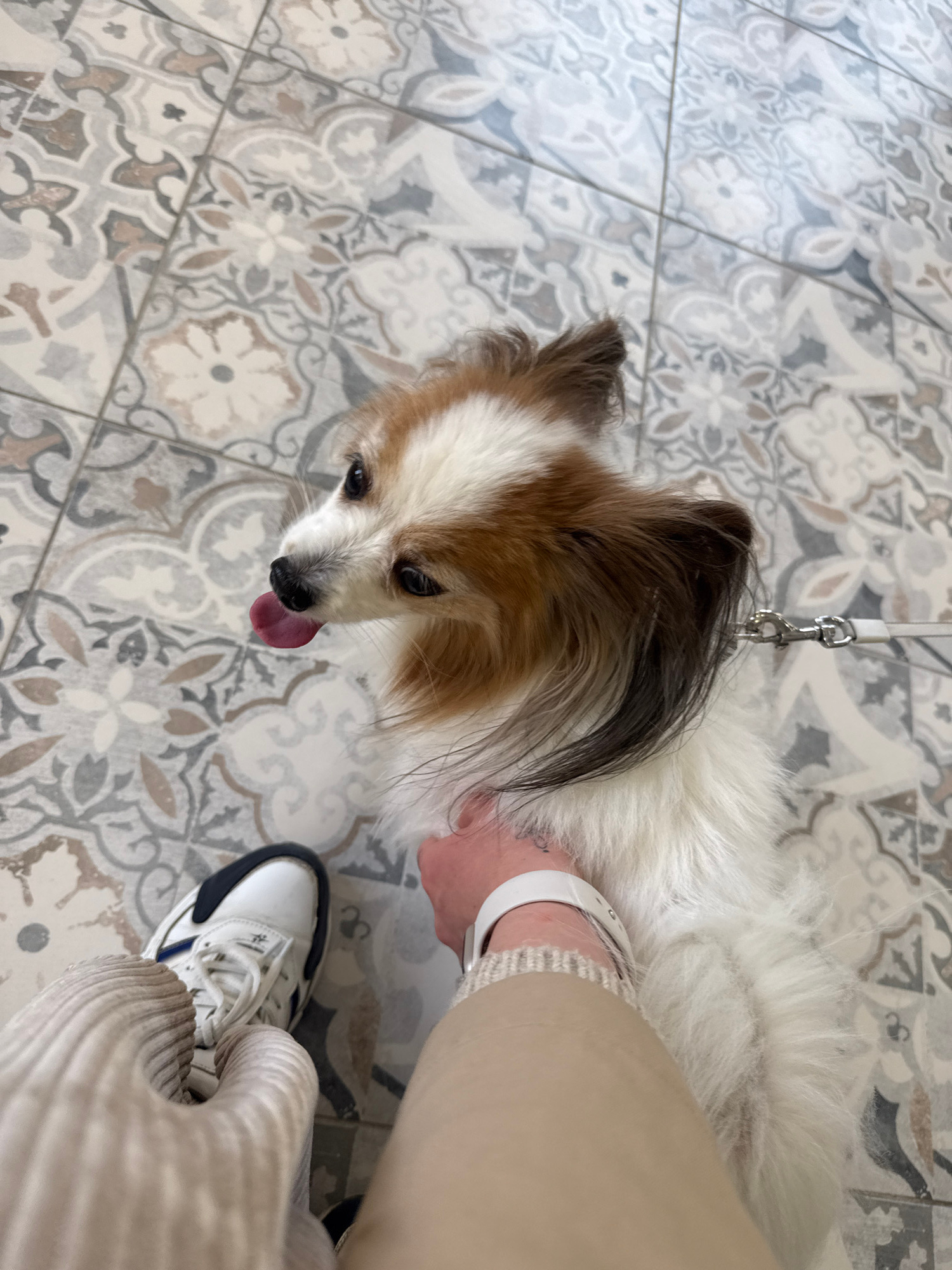 A Papillon dog on a white leash stands on a patterned tile floor. The dog has a white and brown head with a long coat, and its tongue is slightly protruding. A person's hand, wearing a white smartwatc…read more