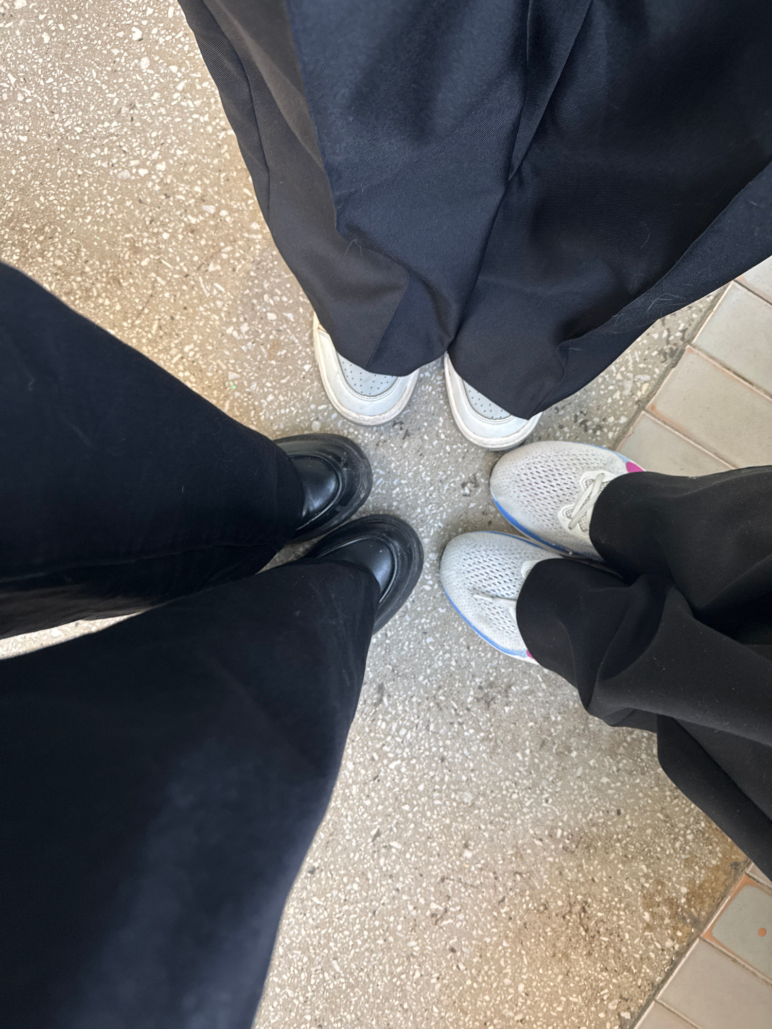 The image presents an overhead view of the lower legs and feet of three individuals, forming a circular arrangement on a speckled floor. All three subjects are wearing dark, likely black, trousers. O…read more