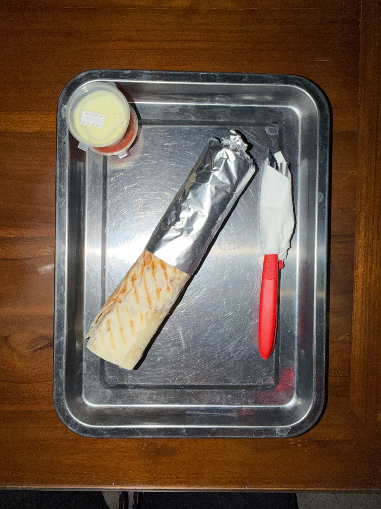 On a wooden surface, likely a table, sits a metallic tray. The tray contains a wrap partially encased in silver foil, a small plastic container with a dual-layered sauce (one layer white-yellow, the o…read more