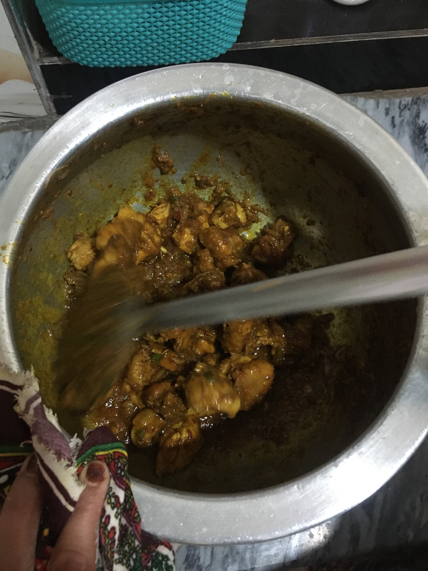 This image captures a close-up, overhead view of a cooking scene in a kitchen in Karamsar, Pakistan. The main subject is a large, used metal pot or wok filled with a rich, yellowish-brown chicken curr…read more