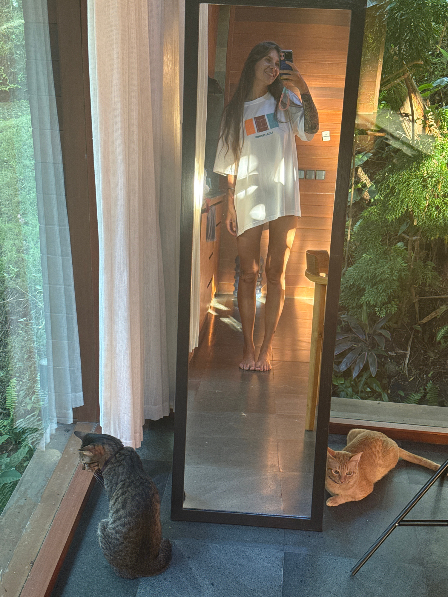 The image depicts a woman reflected in a large mirror, with two cats nearby. The mirror stands against a backdrop of wooden walls and flooring, visible through the reflection. The woman, holding a sma…read more