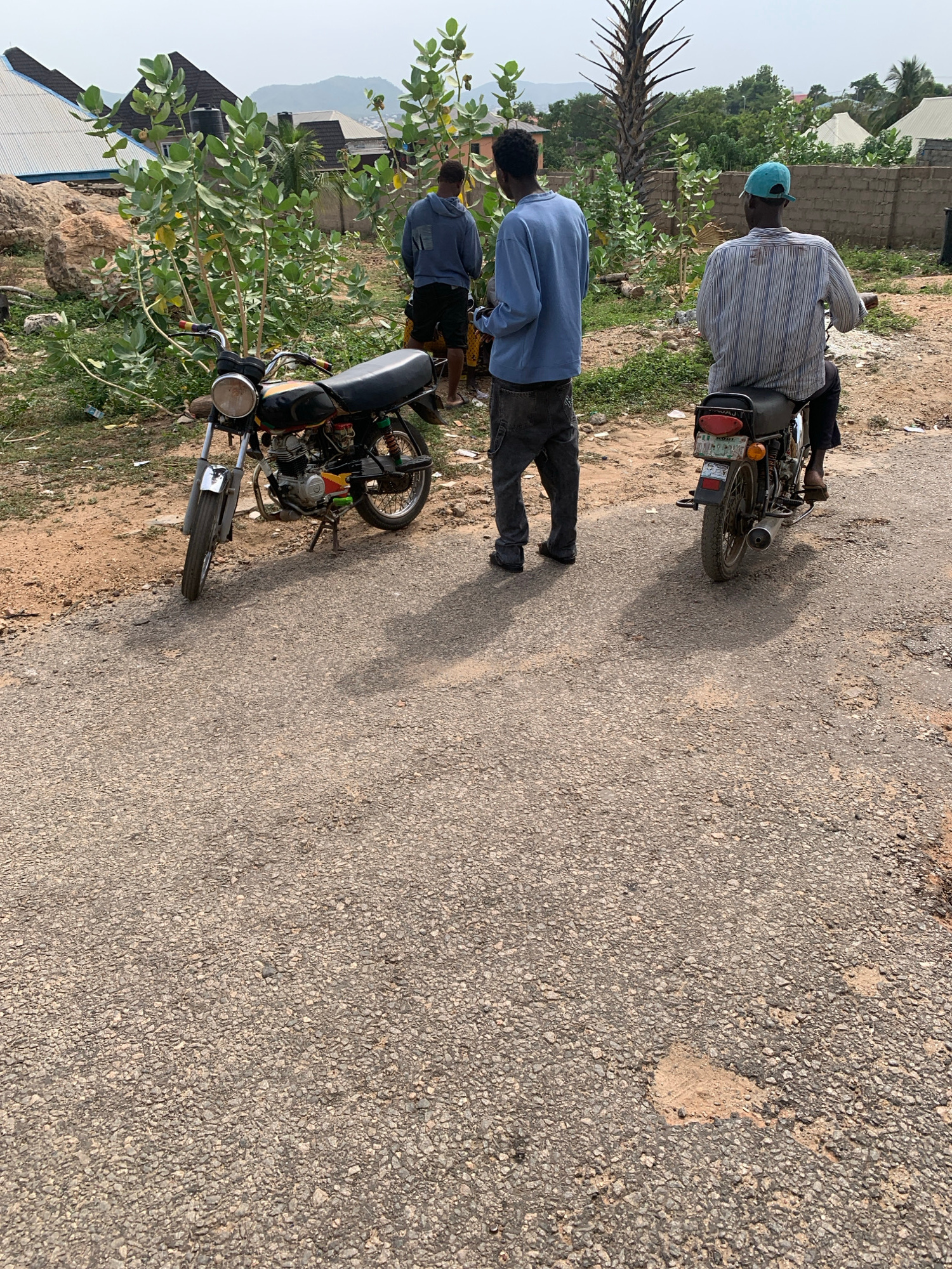 The image shows two men standing beside two motorcycles on a paved road in a semi-urban area, likely in Lokoja, Nigeria. One man is wearing a striped shirt and a blue cap while sitting on a motorcycle…read more