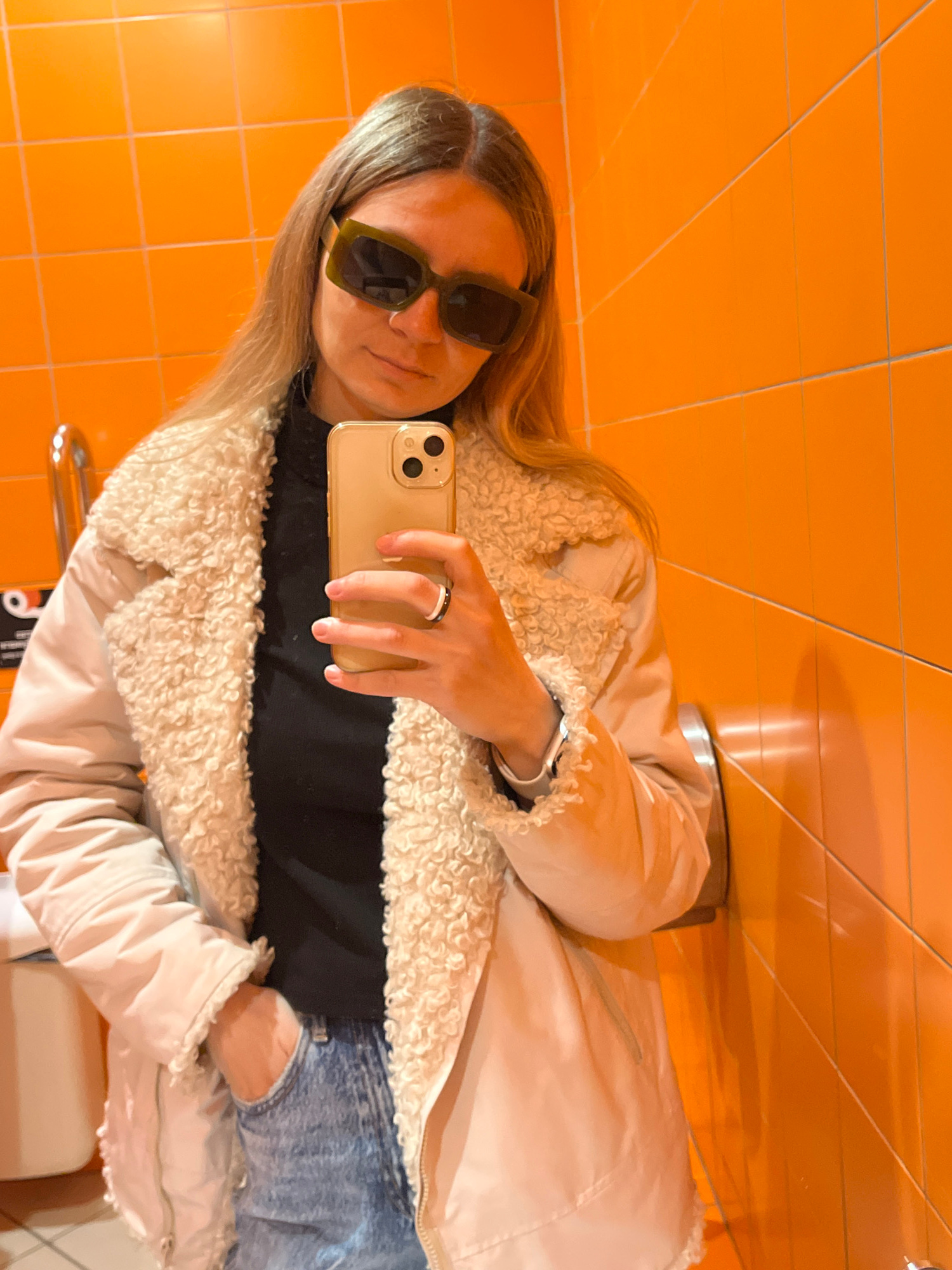 A young woman is taking a selfie in a bathroom with orange tile walls. She is wearing sunglasses, a black top, jeans, and a light-colored jacket with a furry collar. She is holding a gold iPhone in he…read more