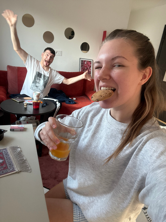 This image depicts an indoor residential scene located in Vozdovac Urban Municipality, Serbia. In the foreground, a light-skinned female with light brown hair is positioned in a selfie. She wears a gr…read more