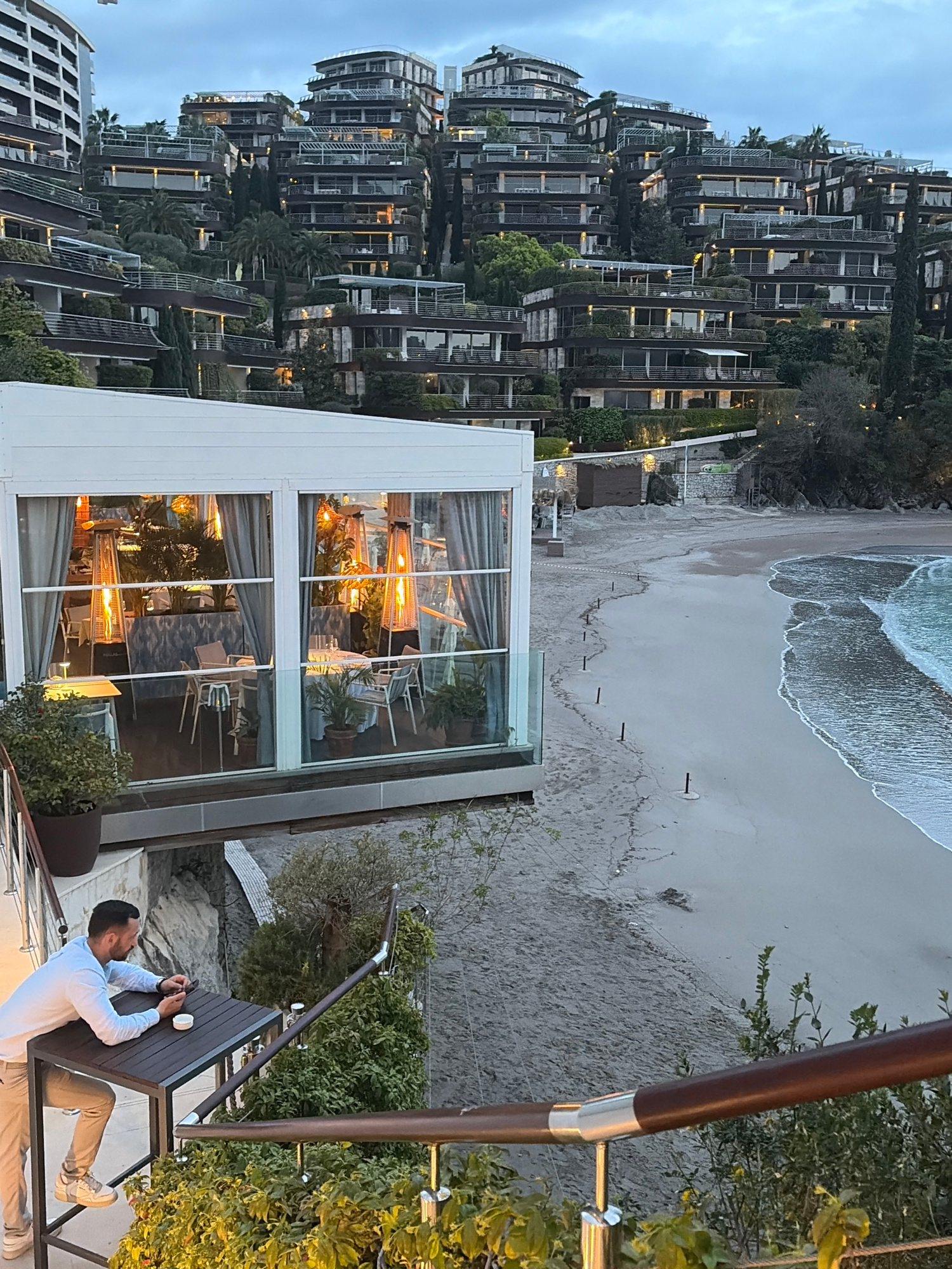 The image shows a view overlooking the beach in Budva, Montenegro, with the Dukley Hotel & Resort visible in the background. The beach is sandy, with the tide coming in, and has some wooden stakes in…read more