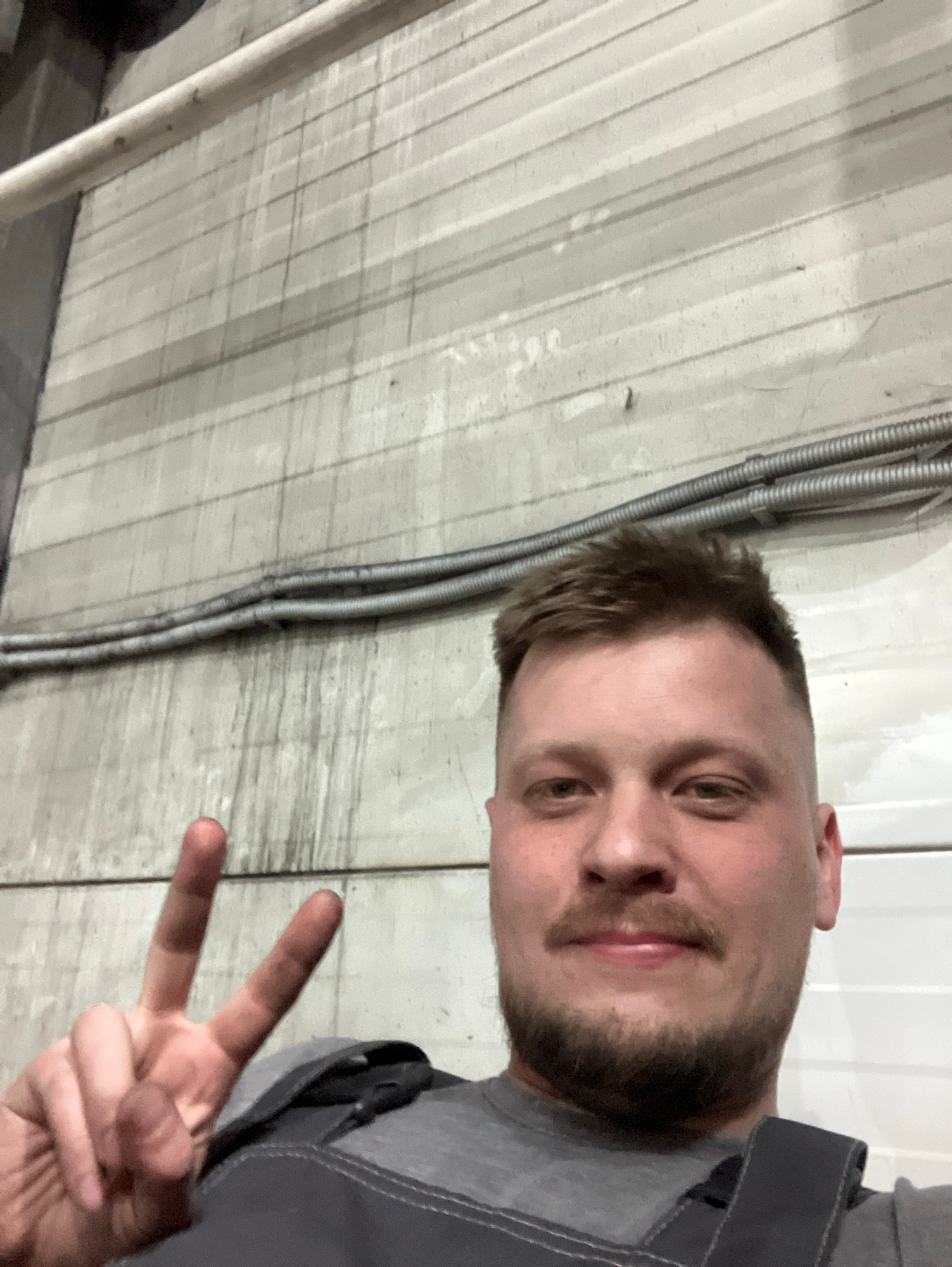 A selfie of a man with short brown hair, a beard, and wearing a gray work uniform. He is holding up a peace sign. He appears to be indoors with corrugated metal walls and some conduit in the backgroun…read more