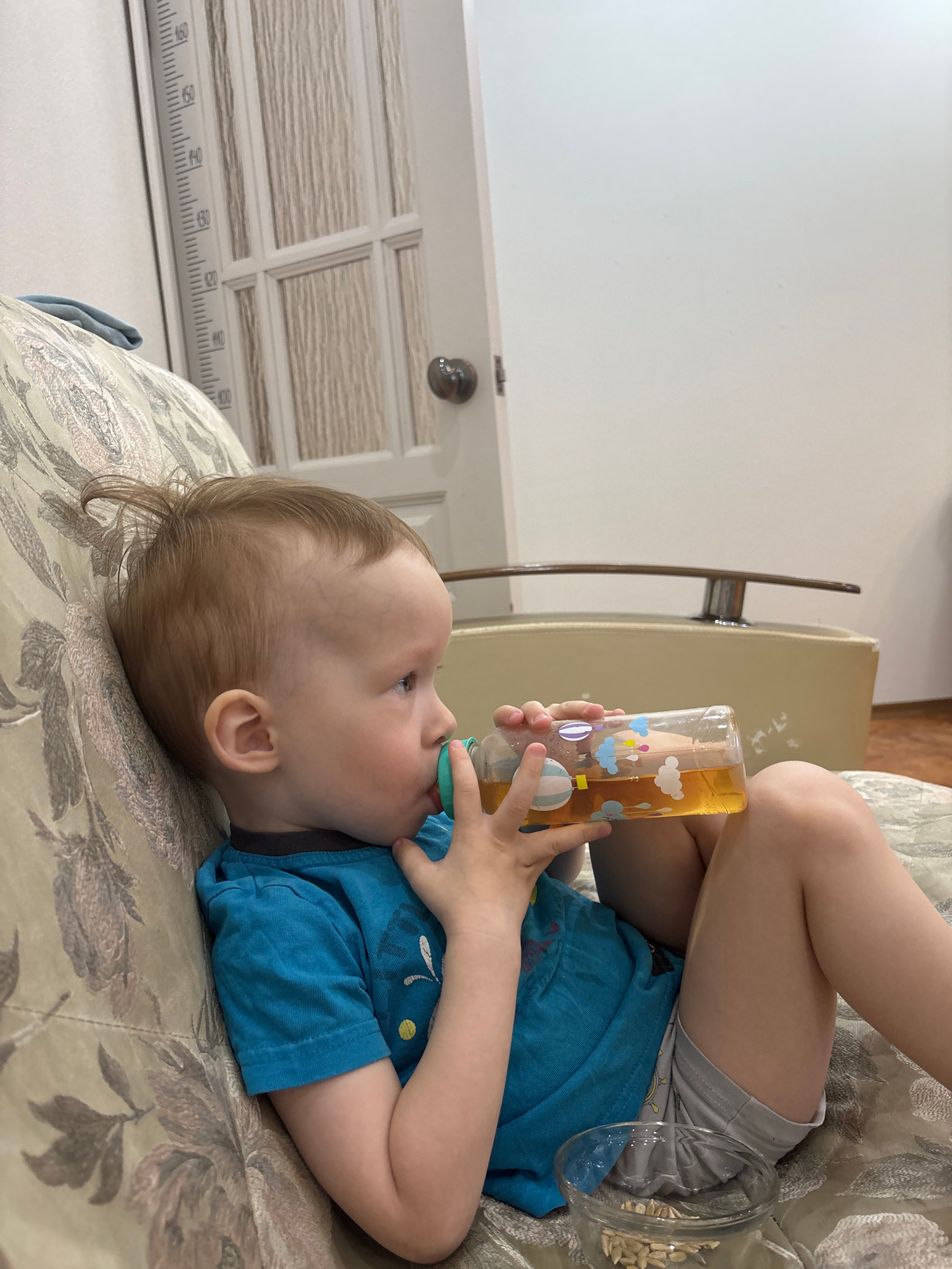 A child is lying on a patterned sofa while drinking from a plastic bottle with hot air balloon designs. The child is wearing a blue shirt and gray shorts. The sofa is upholstered with a beige and brow…read more