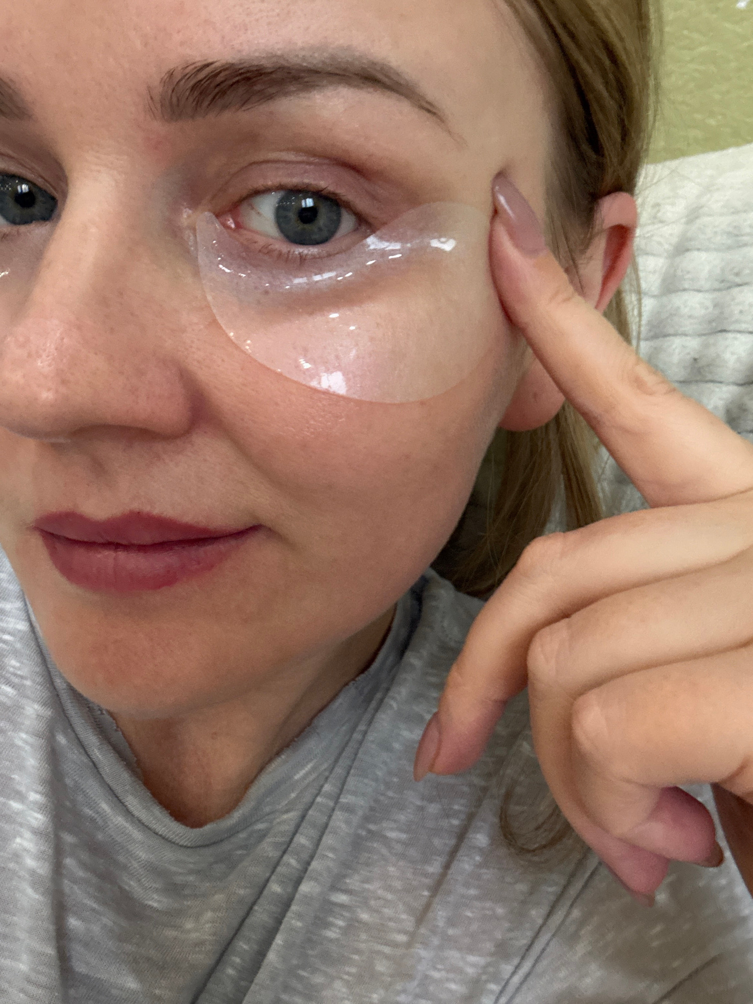 A woman is depicted indoors, engaged in a self-care routine, possibly in Chaikovsky, Russia. She is seen from a slightly elevated angle, lying down with her head resting on a light grey, textured fabr…read more