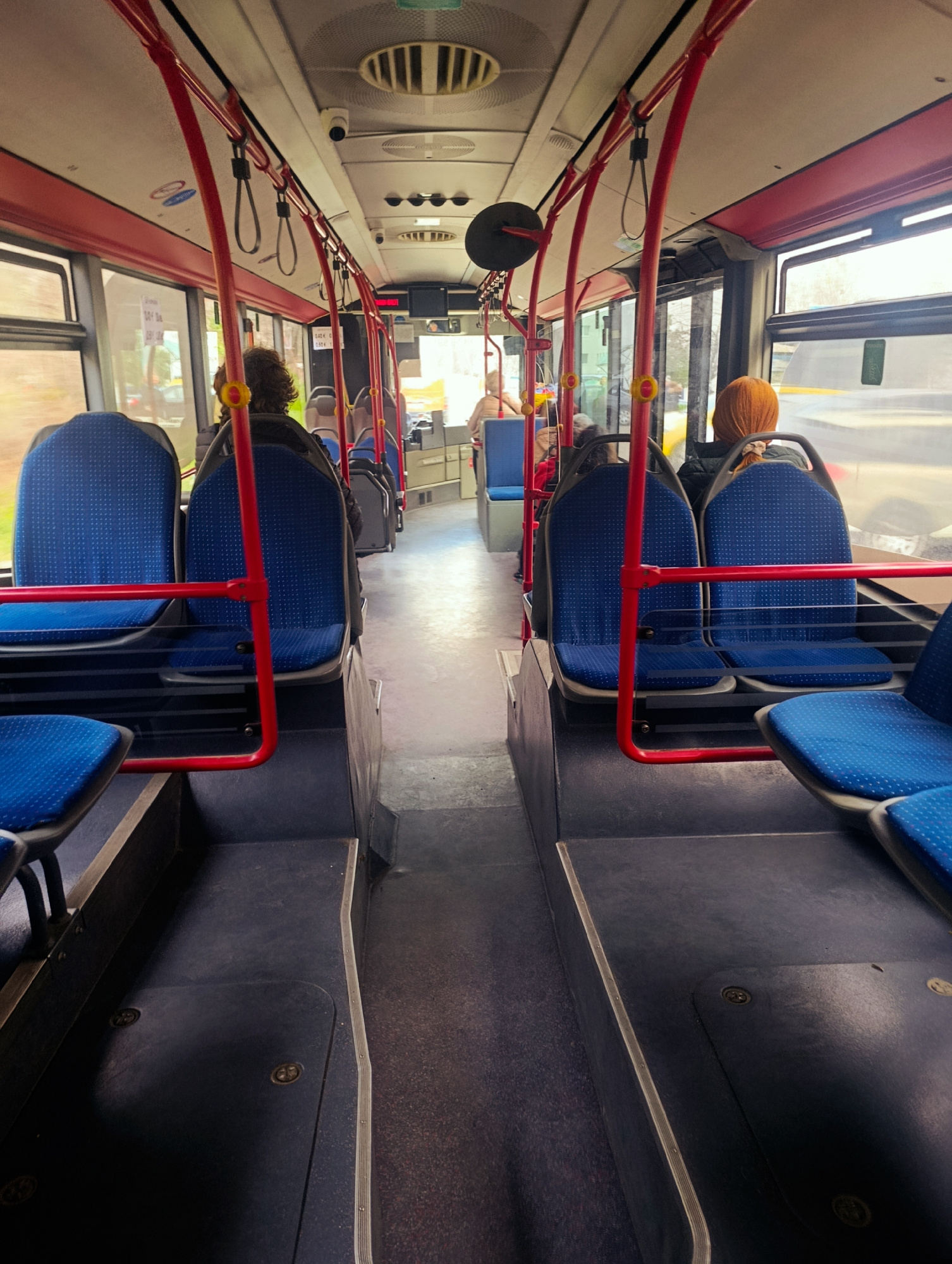 The image shows the interior of a bus. Blue patterned seats line the sides of the aisle, separated by red metal bars. Several passengers are seated, their backs to the camera. A surveillance camera is…read more