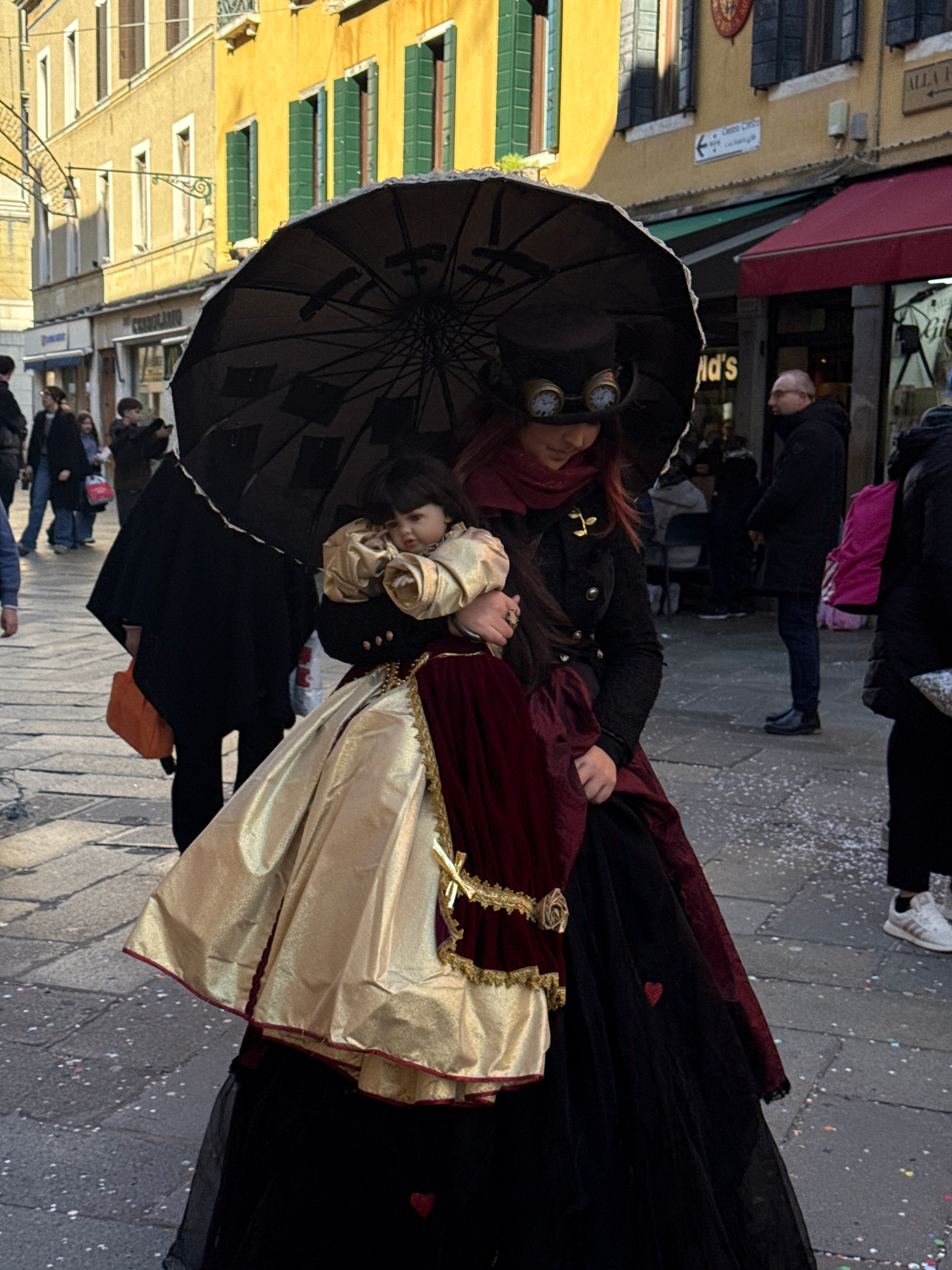 A person in a dark, steampunk-inspired costume stands on a cobblestone street in Venice, Italy. The individual wears a black top hat with brass-colored goggles, a dark red scarf, a black jacket, and a…read more