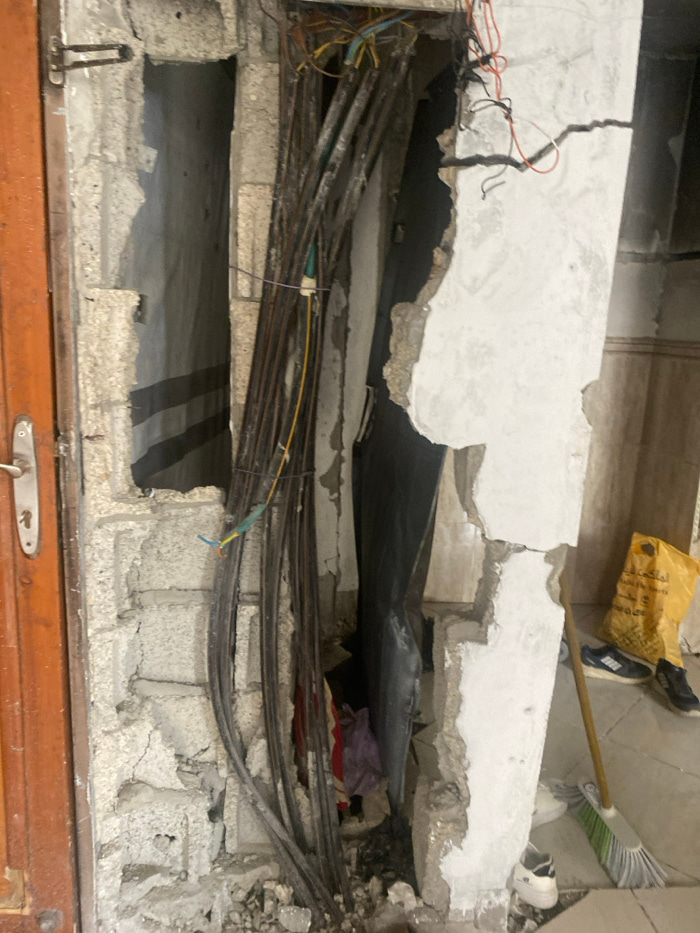 The image displays a severely damaged interior wall section within a building in Khan Yunis, Palestinian Territory. On the left, a partially visible brown wooden door with a silver handle is set withiβ¦read more