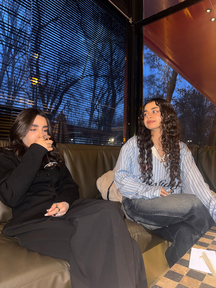 Two young adult females are seated inside a modern cafe or restaurant in Yerevan, Armenia, during twilight hours. The woman on the left, with long dark hair, is dressed in a black cardigan and black w…read more