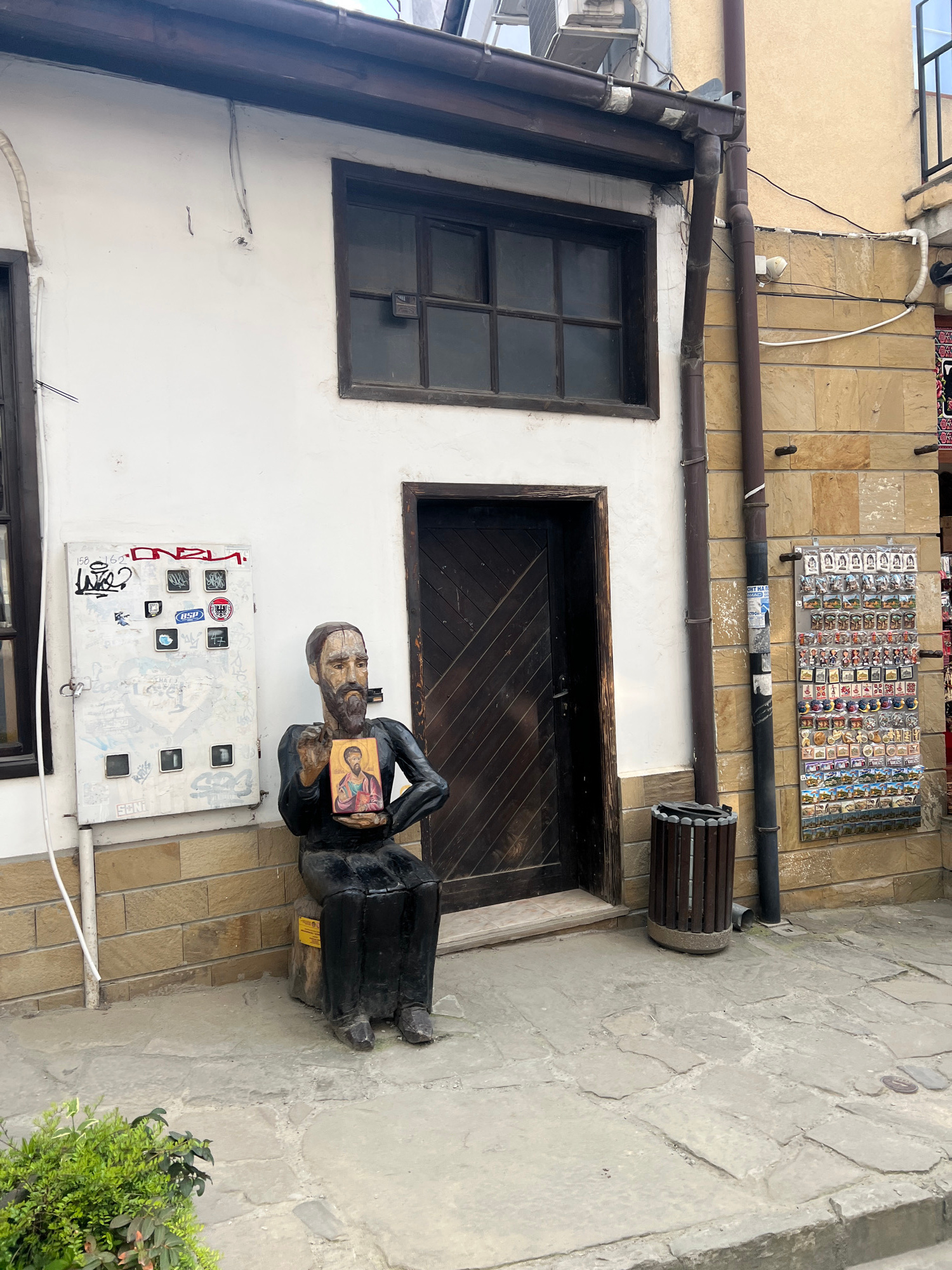The image captures a detailed view of a narrow, stone-paved alley or courtyard in Veliko Tarnovo, Bulgaria, under clear daytime conditions. The central subject is a life-sized, dark-robed statue of a…read more