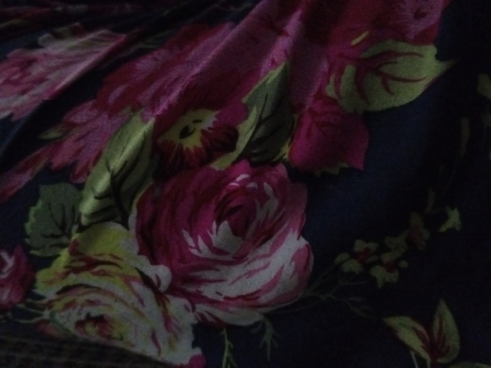 The image depicts a close-up view of a floral-patterned fabric. The dominant colors are shades of pink, white, green, and a dark blue background. The fabric is bunched or folded, creating a sense of d…read more