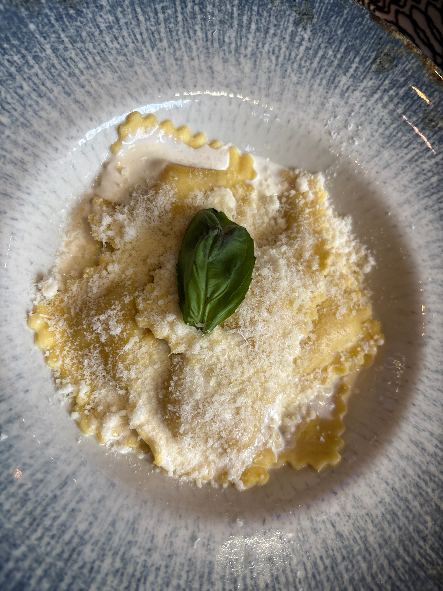 A high-angle, close-up shot depicts a serving of ravioli in a light sauce, liberally topped with grated cheese and garnished with a single basil leaf. The food is presented in a grey and white pattern…read more