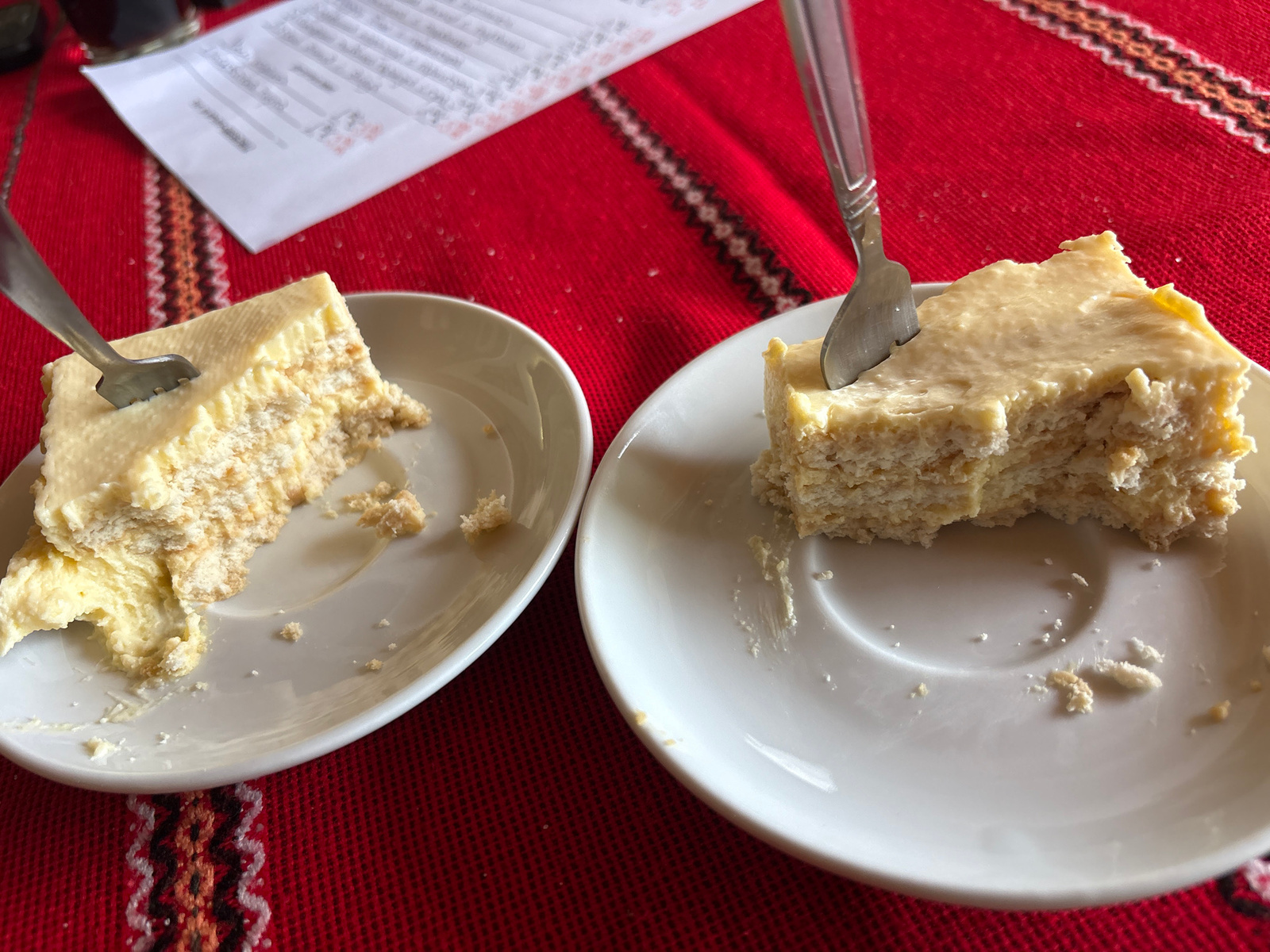 Two pieces of cake rest on separate white plates atop a red tablecloth with a geometric pattern. Each cake piece is pierced with a silver fork. A piece of paper with text is partially visible in the upper left corner, suggesting a menu or receipt. The location is Tryavna, Bulgaria, based on visual context and available data. The scene depicts a meal setting, likely in a restaurant or café in Tryavna. No people are visible in the image. | Open Wire