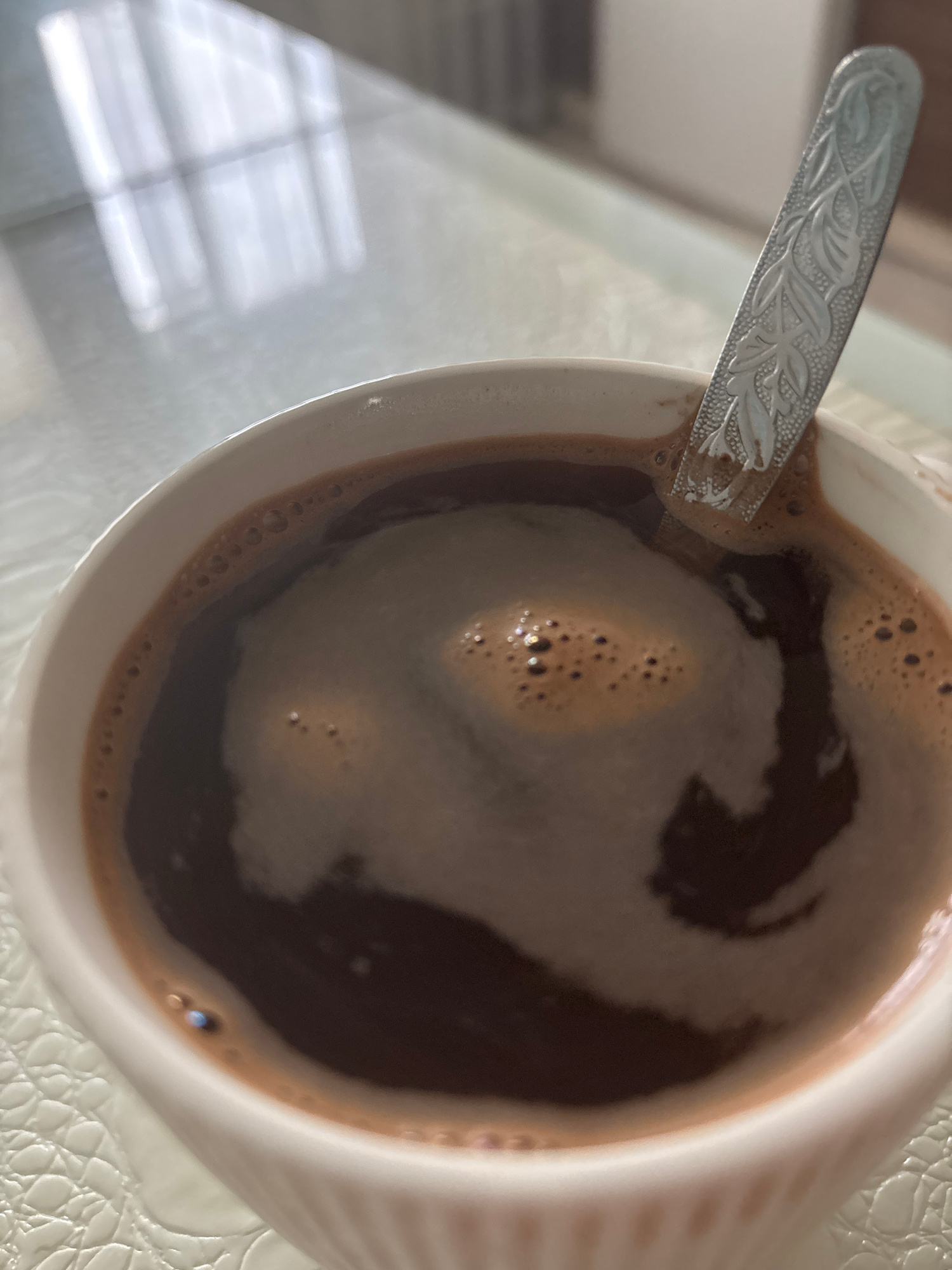 A high-angle, close-up shot shows a white ceramic mug filled with a dark brown beverage, possibly coffee with milk. A silver-colored spoon with decorative etchings is partially submerged in the liquid…read more