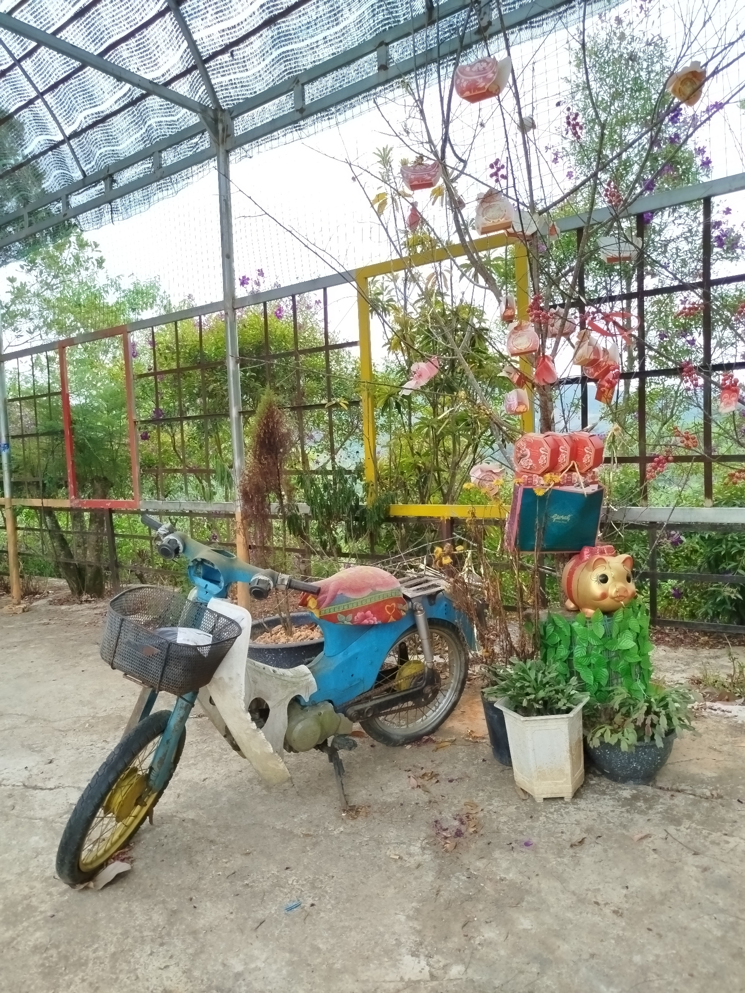The image depicts a weathered, vintage blue motorcycle with a front basket parked in a concrete area, possibly a courtyard or patio. The motorcycle exhibits signs of age and disrepair. Behind it, ther…read more
