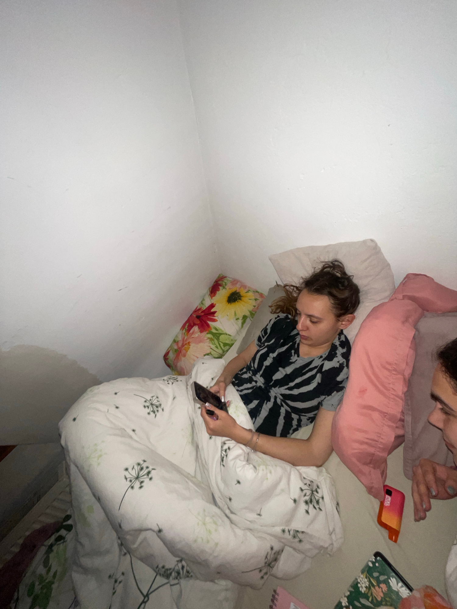 The scene appears to be an interior view from an elevated perspective, possibly taken inside a residential space. The location is identified as Saarbrücken, Germany. Two individuals are visible. One is sleeping, seen lying down in the bed, covered with white comforter patterned with green botanical illustrations. The person is positioned with their head resting on a pillow with a floral pattern. The person is wearing a black and white striped shirt and holding a black mobile phone in their hand. Another person is near the sleeping person. Objects in the scene include pillows (one pink, one gray), a comforter, a notebook with a floral cover, and an orange-colored electronic device. The walls are painted white. The primary action observed is sleeping. There appear to be no immediate interactions or events occurring other than the act of sleeping. | Open Wire