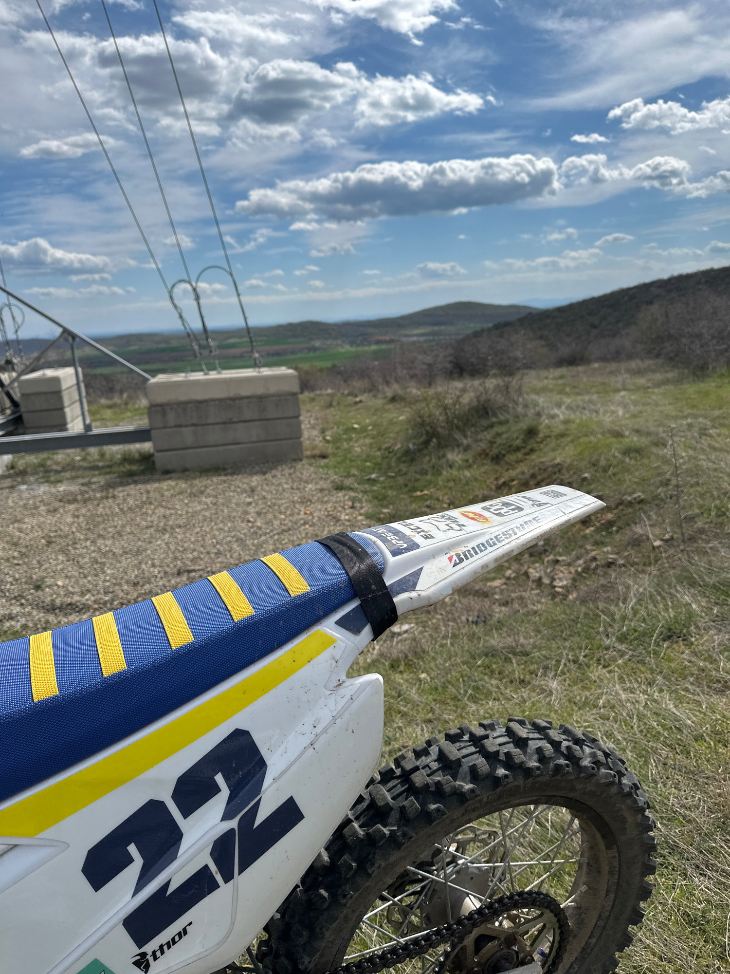 The image shows a dirt bike in a rural area, potentially near electrical infrastructure. The bike's front fender has stickers from Bridgestone and other brands. The seat is blue with yellow stripes, a…read more