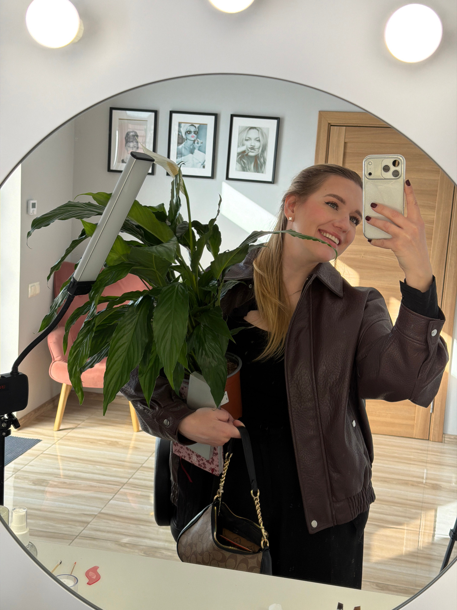 The image shows a woman taking a selfie in a mirror. The mirror is round and has lights around the perimeter. The woman is holding a smartphone in her right hand. She is wearing a brown leather jacket…read more