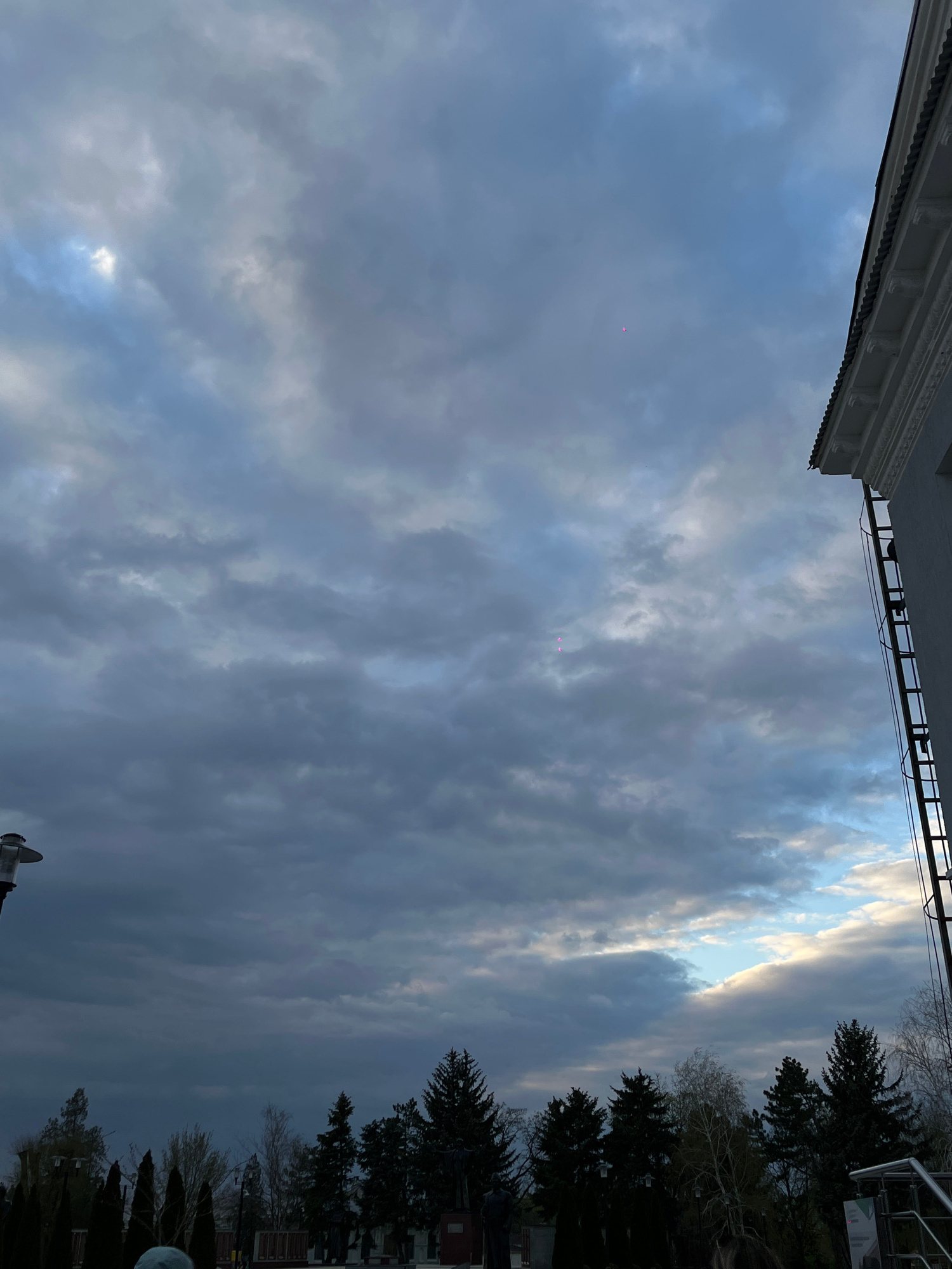 The image, taken from a low angle, features a cloudy sky in Novopokrovskaya, Russia. The upper portion of a building's architectural details is visible at the top left, while trees and some structures…read more