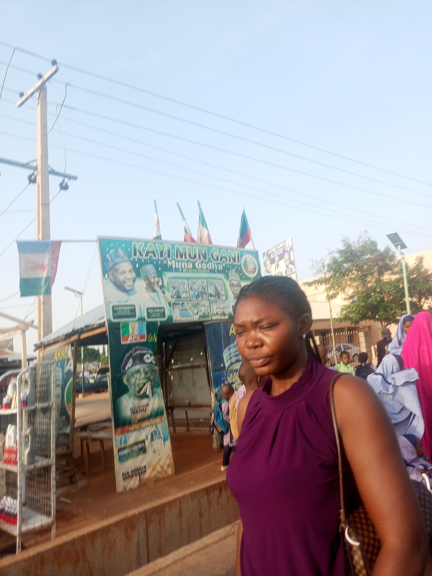 The image depicts a street scene in an urban location. In the foreground, a dark-skinned woman wearing a purple sleeveless top and carrying a patterned handbag is partially visible. Behind her, there…read more