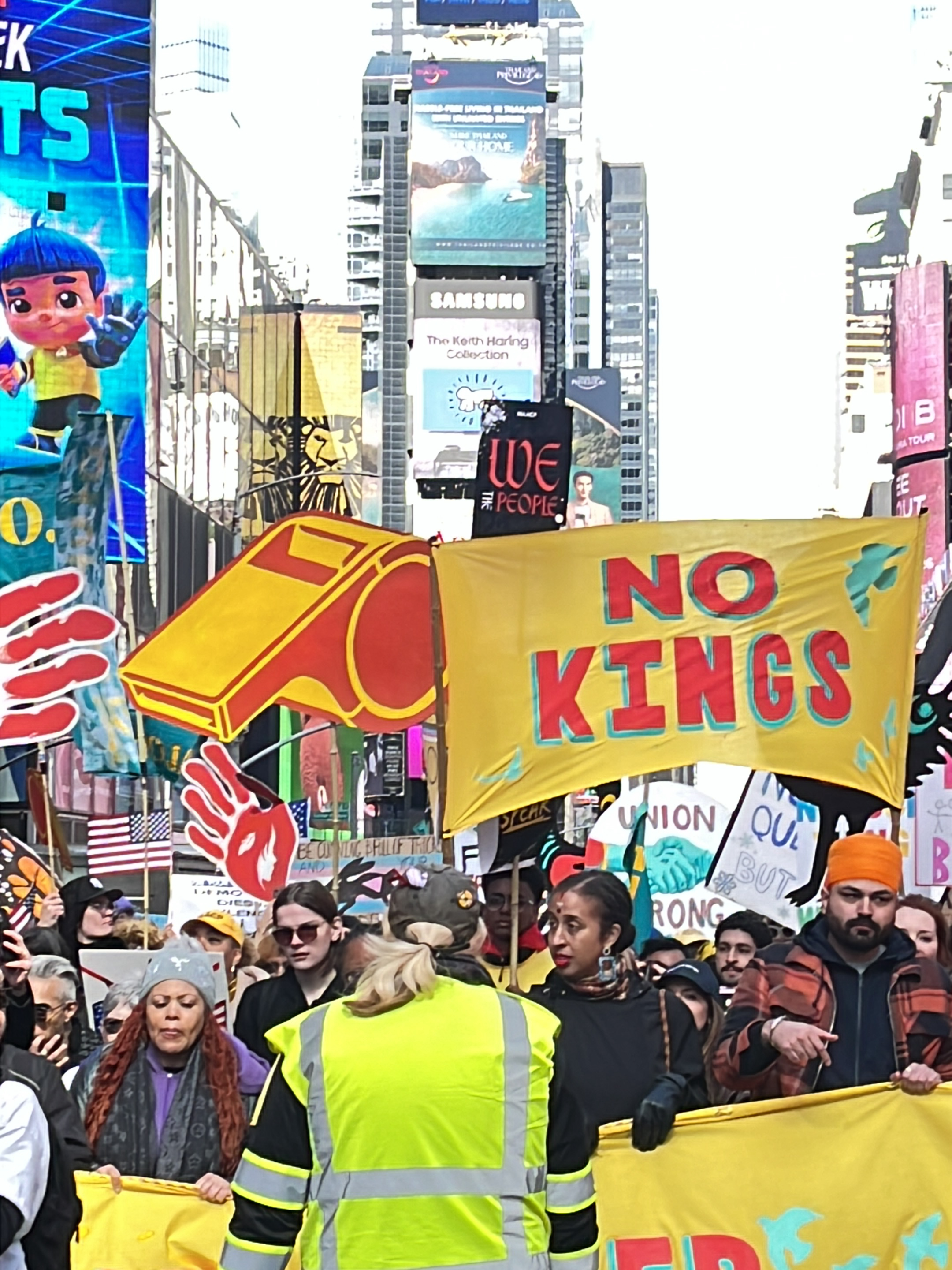 The photo shows a group of people marching, holding signs and banners with messages such as "No Kings" and "Union Strong." The presence of numerous signs and the crowd suggest a protest or demonstrati…read more