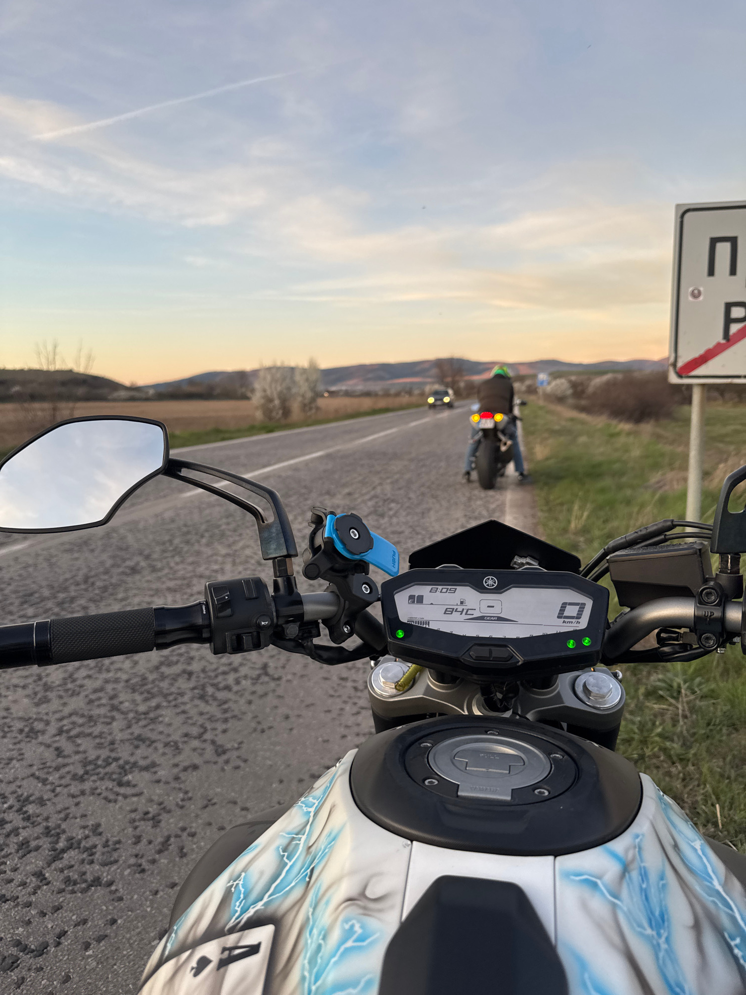 The image depicts a motorcycle's point-of-view shot on a paved road near Belanitsa, Bulgaria. The motorcycle's dashboard indicates a speed of 0 km/h and a time of 8:09. The fuel tank has a white and g…read more