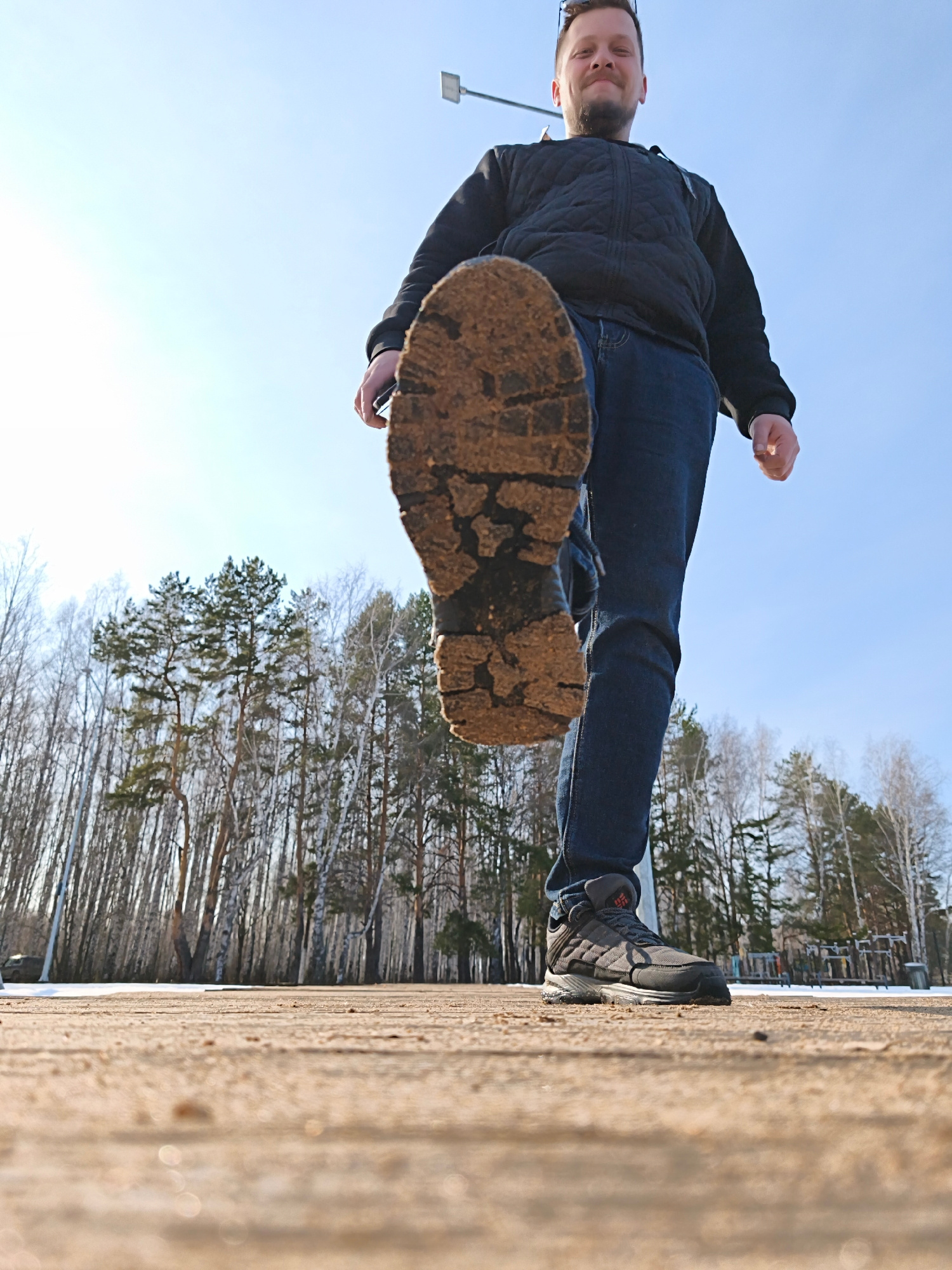 A low-angle shot depicts a man standing on a wooden surface. His right leg is raised, with the sole of his boot facing the camera, covered in mud or dirt. The man is wearing jeans and a dark quilted j…read more