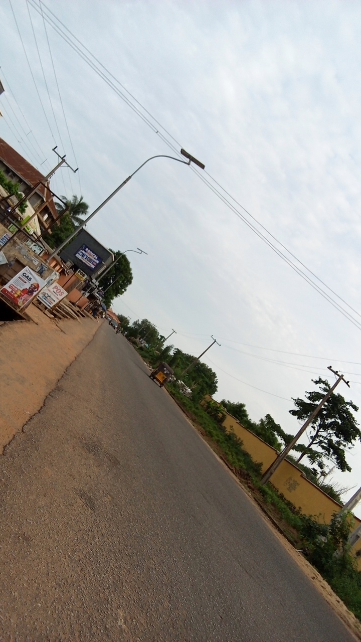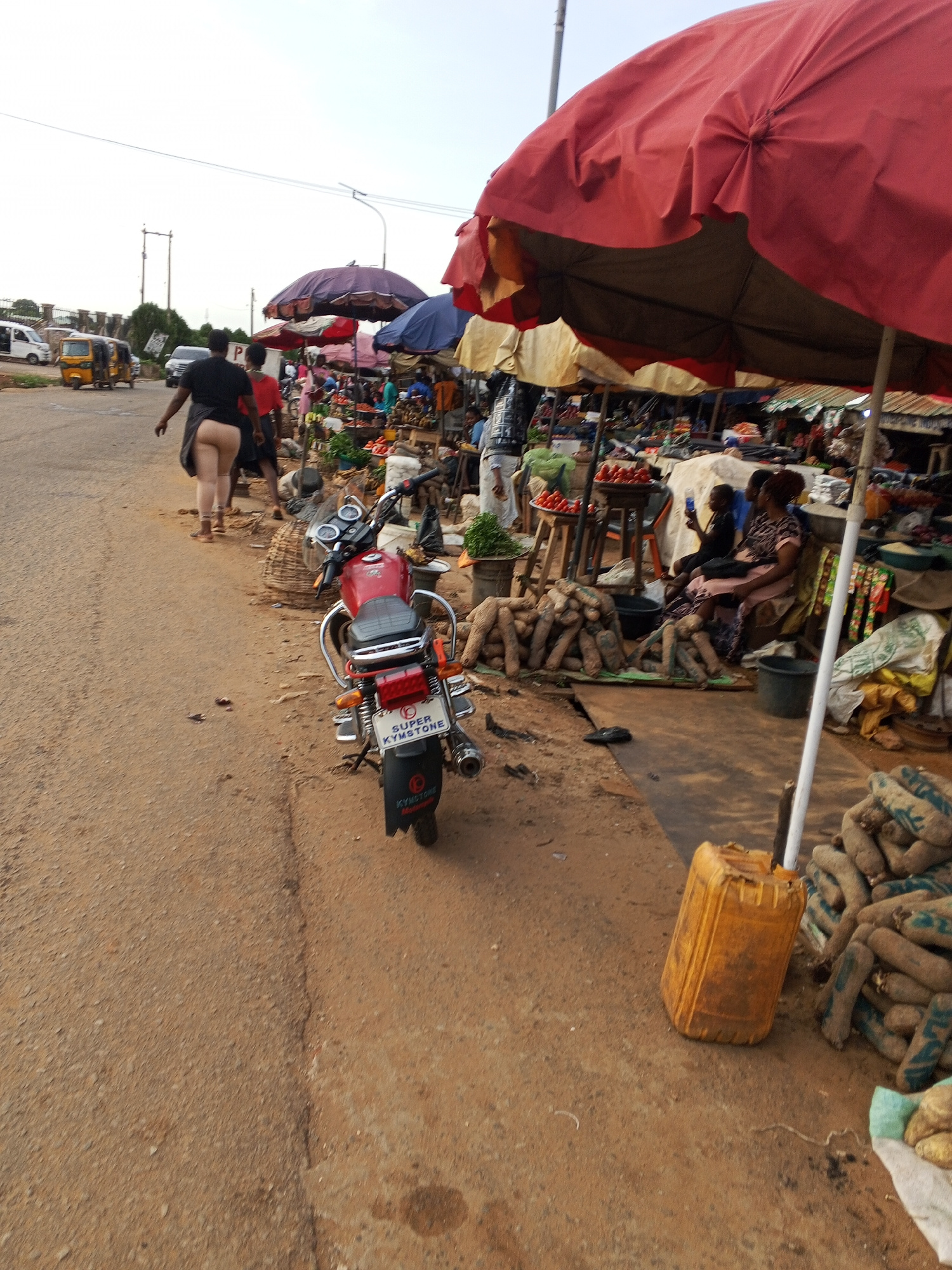 A bustling roadside market in Nsugbe, Nigeria, is captured in a medium-distance shot. The market is situated on a dirt road, lined with vendors selling various goods under colorful umbrellas. A red mo…read more