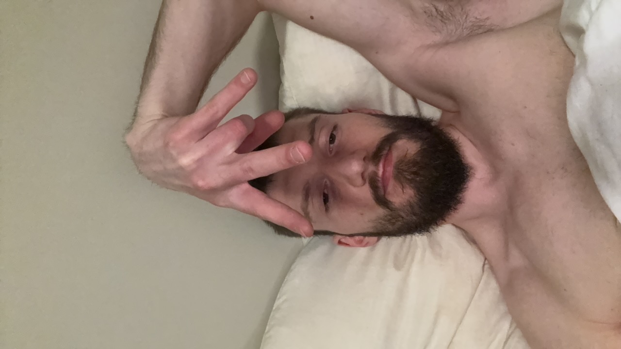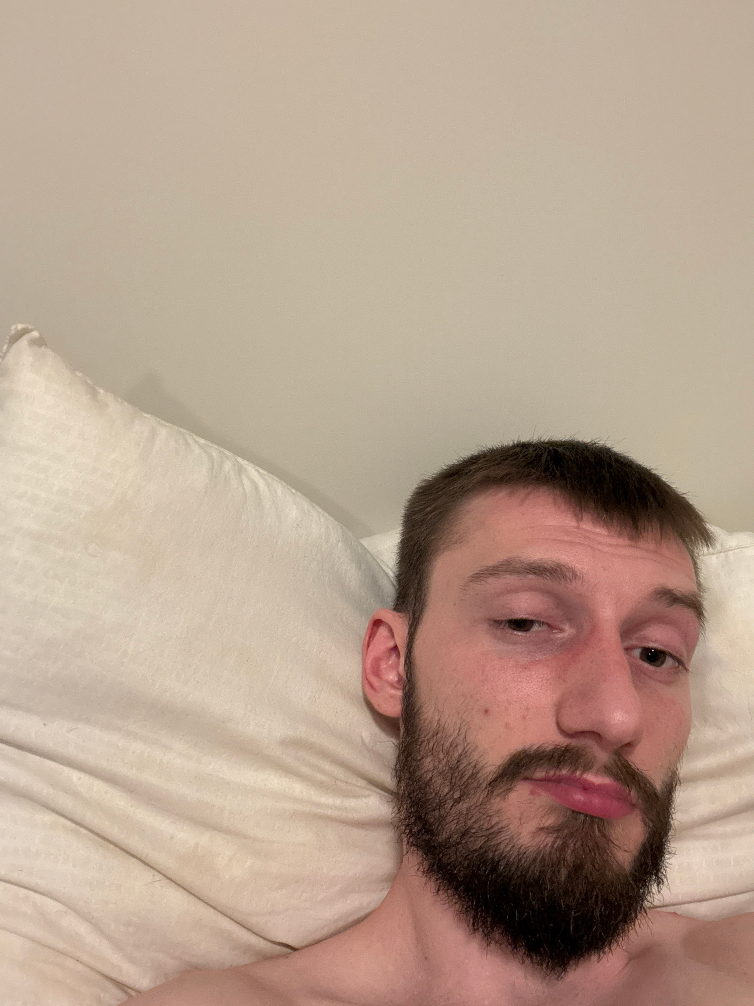 A man with short brown hair and a beard is lying on a light-colored pillow. He is facing the camera with a neutral expression. The background is a plain light-colored wall. The location of the image b…read more