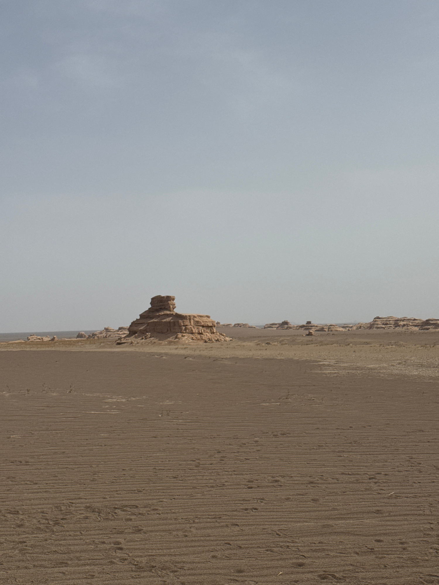 The image depicts a landscape in Dunhuang City, China. The scene is dominated by a desert or barren terrain on the right side, characterized by ridges and texture. On the left, a greyish sky occupies…read more
