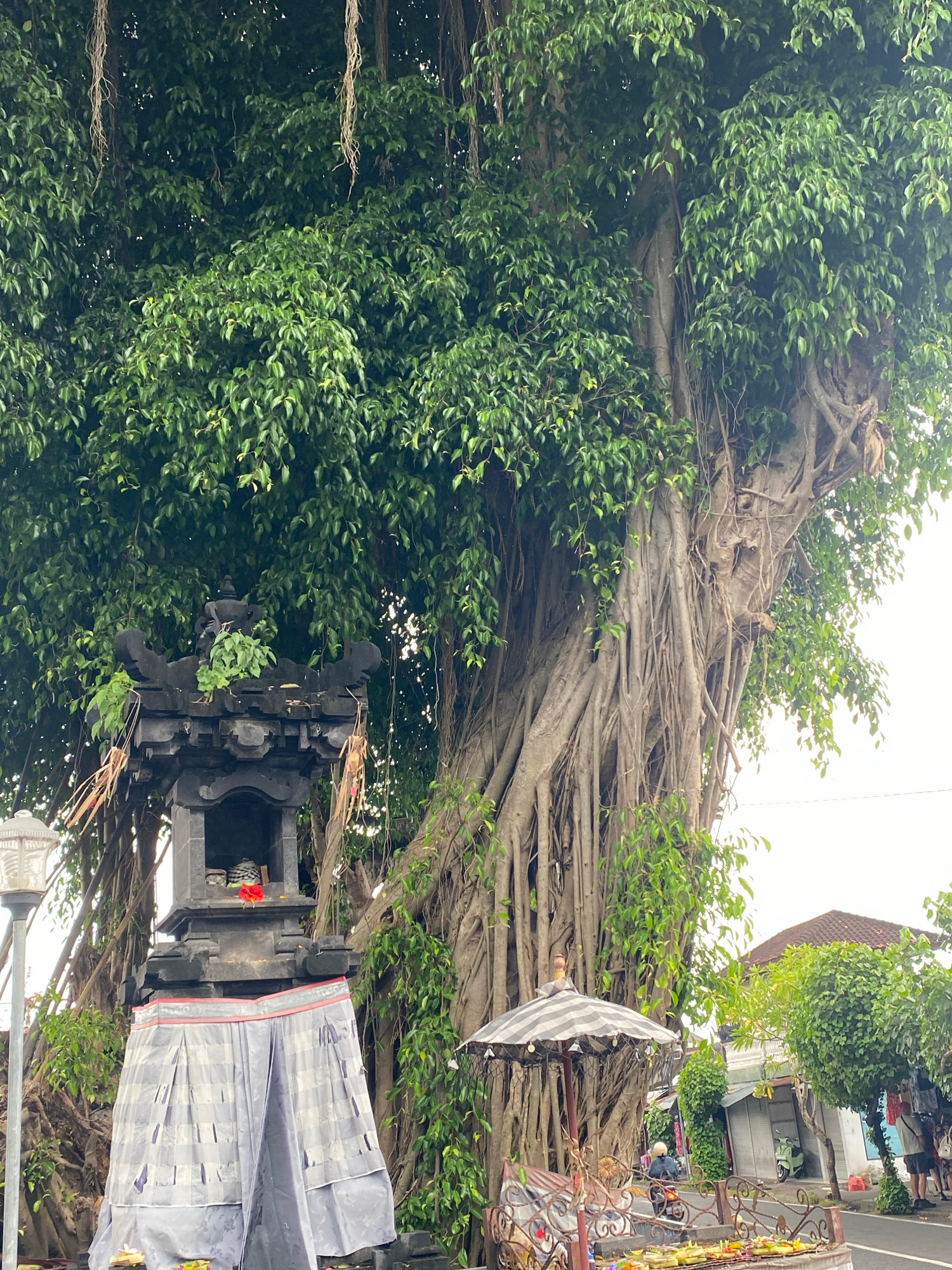 The image captures a vibrant outdoor scene dominated by a massive, ancient banyan tree. The tree features abundant, dense green foliage and an intricate network of thick aerial roots that intertwine a…read more