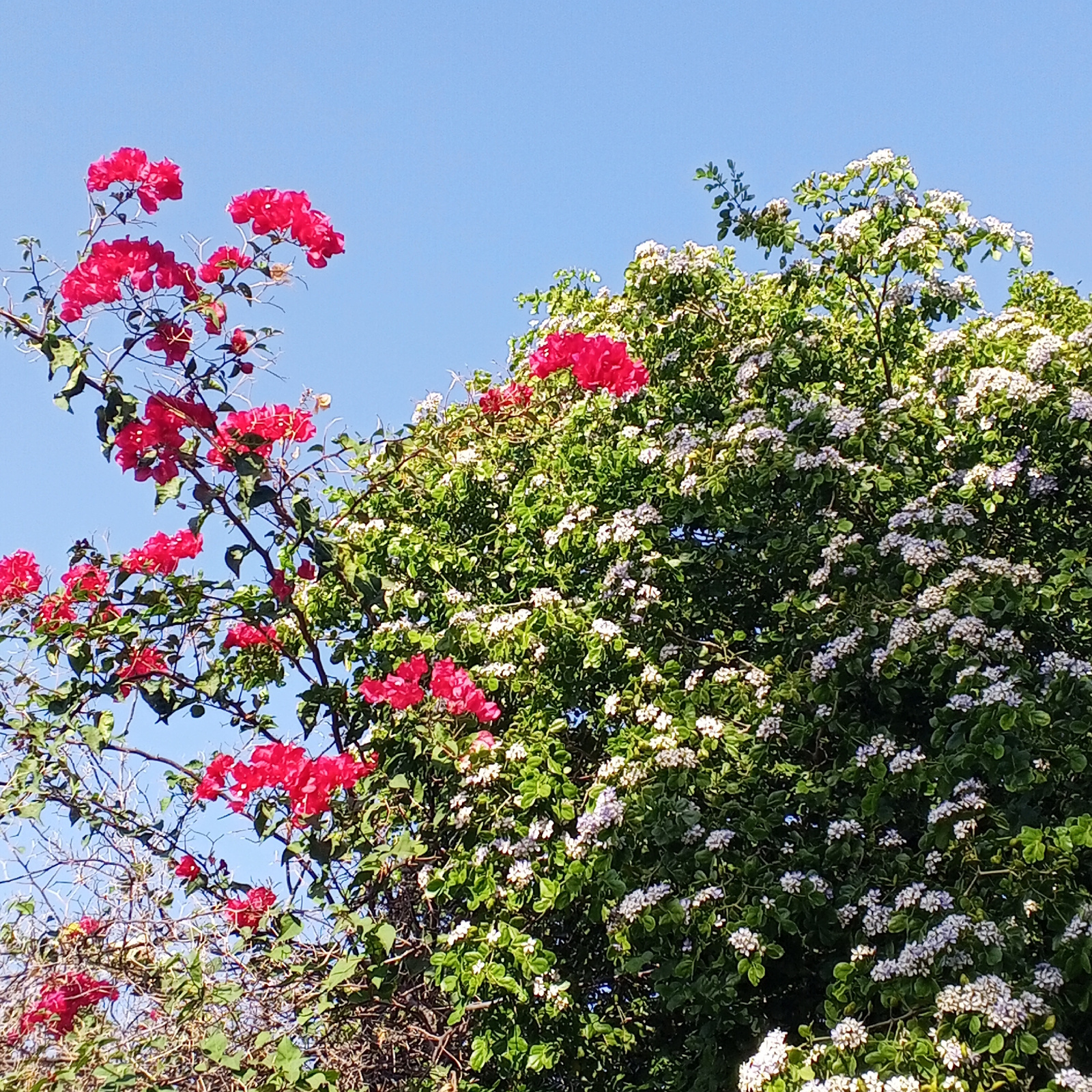 The image shows a daytime view of a bougainvillea plant with bright pink flowers climbing alongside a tree covered in small white flowers. The sky is clear blue. The location is Altagracia, Venezuela.