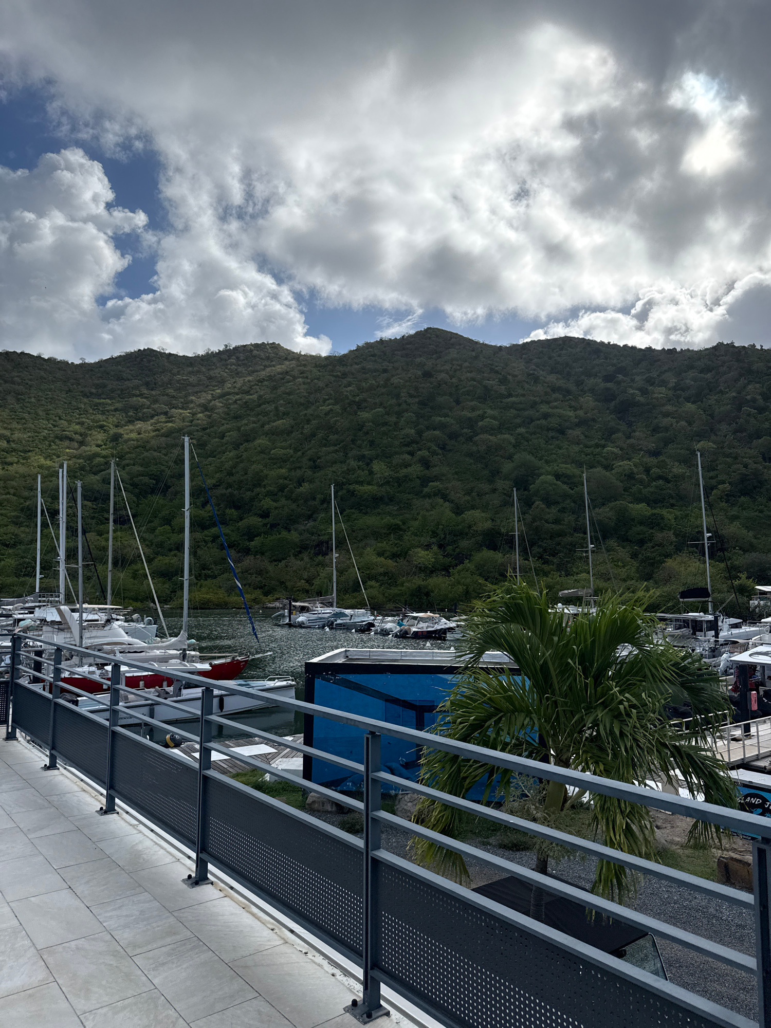 The image depicts a marina scene in Saint-Martin, France, with a mountain covered in dense green vegetation as a backdrop. In the foreground is a grey metal walkway structure. Beyond the walkway, seve…read more