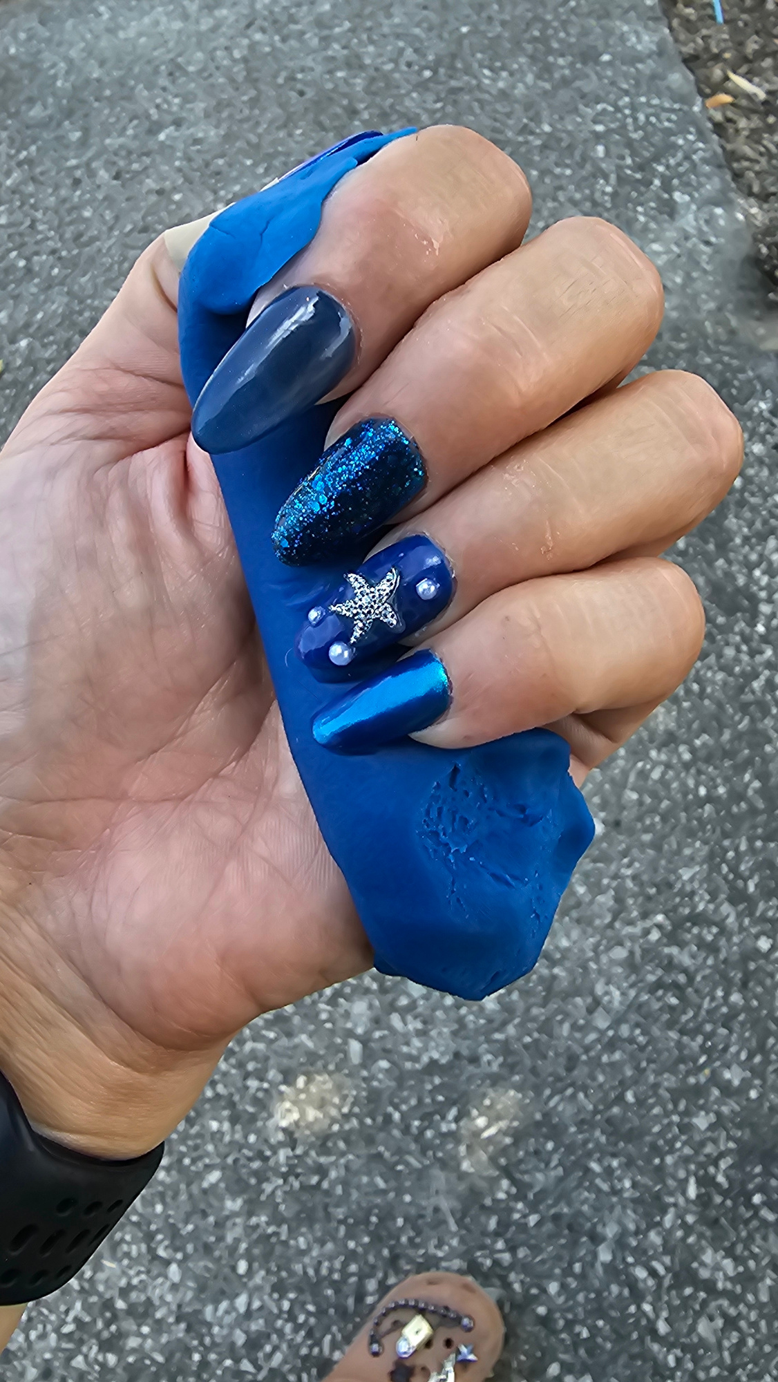 A close-up photograph shows a person's hand holding a lump of bright blue clay. The hand has manicured nails, each with a different blue design: one is a glittery blue, one has a star and small pearl-…read more