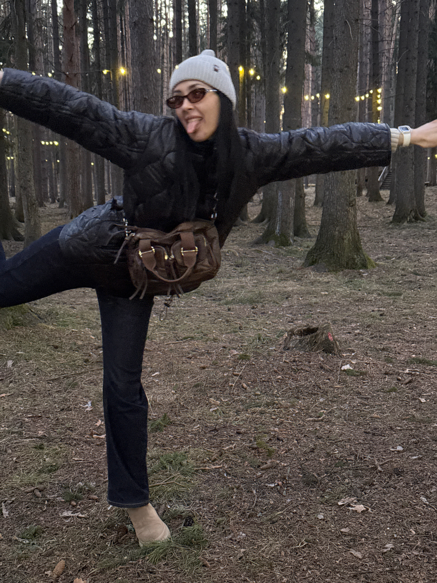 The image portrays a person striking a dynamic, playful pose in a forest setting, likely in Votkinsk, Russia. The individual, an adult with dark hair, is dressed for cool weather, wearing a grey knit…read more