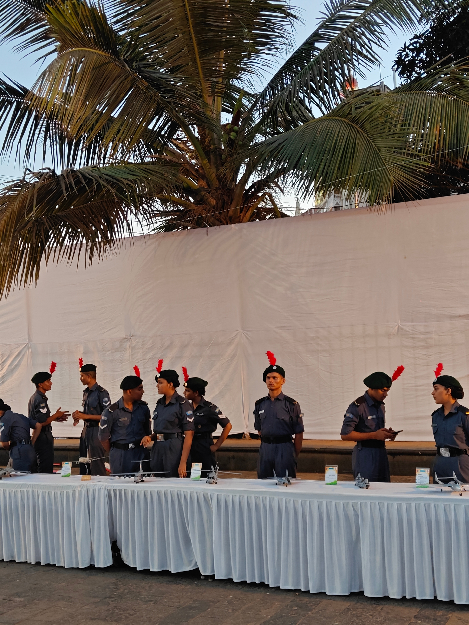 The image shows a group of people standing behind a white draped table, likely outdoors. They are wearing uniforms with dark blue shirts and pants, black belts, and black hats with red plumes. The uni…read more