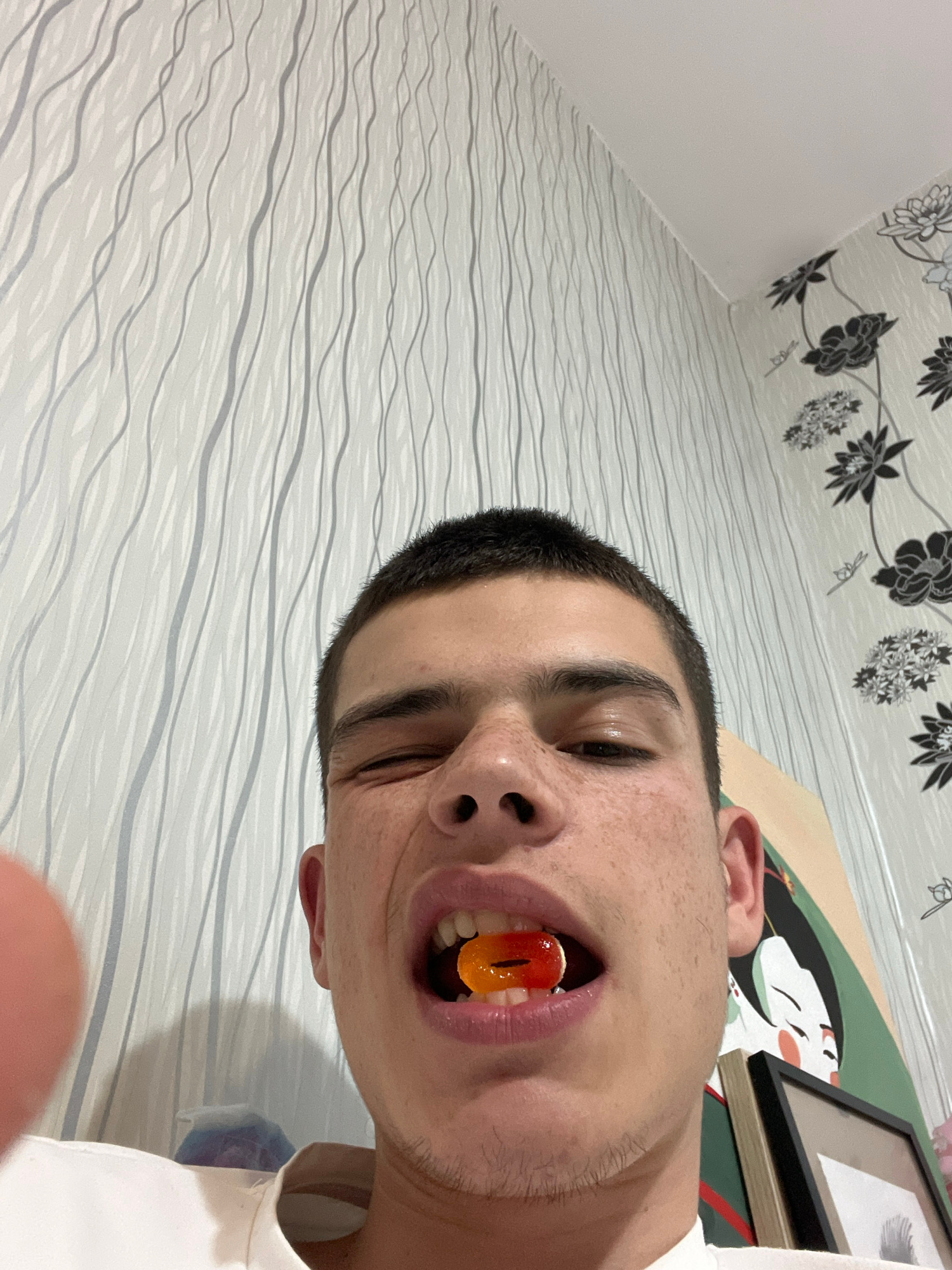 A young adult male with short dark hair is holding a gummy candy between his front teeth. He is lying on his back with his head tilted, facing the camera. The background includes a white wall with gra…read more